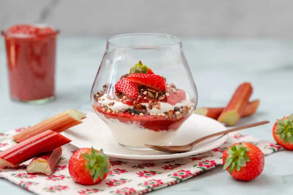 Ontbijt trifle met Griekse yoghurt, muesli en rabarber