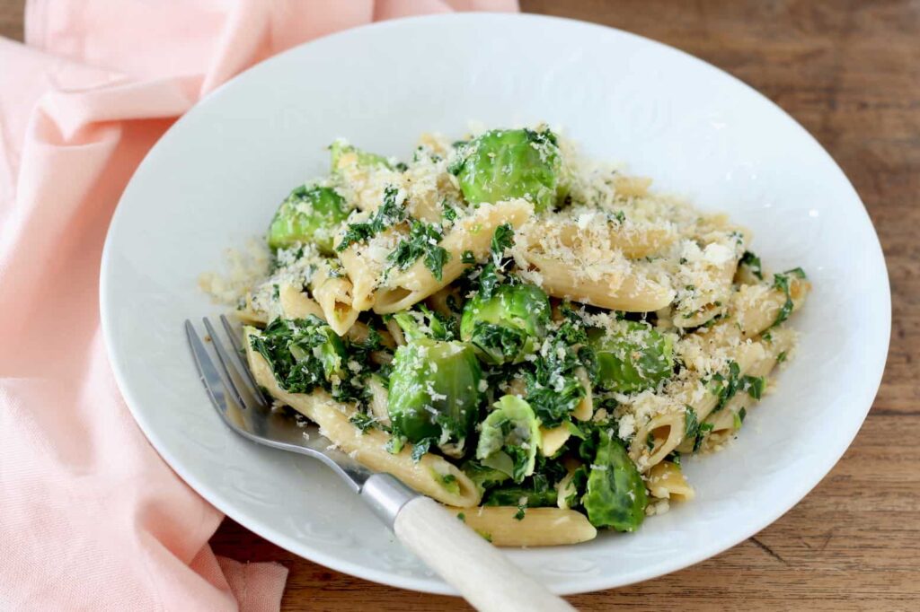 Samenwerking – Dit weer vraagt om verwarmende comfort food gerechten. Zoals deze pasta met spruitjes, boerenkoolpesto en hazelnoten bijvoorbeeld. Die je heel makkelijk maakt en waar zelfs onze kinderen thuis dol op zijn door de smaak die de boerenkoolpesto geeft aan het gerecht. De hazelnoten geven een lekkere crunch mee