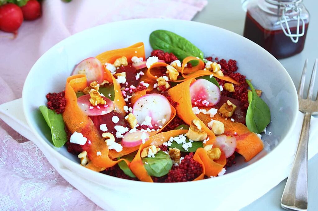 Wat een heerlijke combinatie is dit toch als je zin hebt in een winterse salade. Een quinoasalade waarin ik boerenkool, peen, venkel en granaatappel met elkaar heb gecombineerd. En die combinatie werkt beter dan ik had kunnen dromen. Nog lekkerder wordt de salade als je wat granaatappelmelasse (van Souq) of