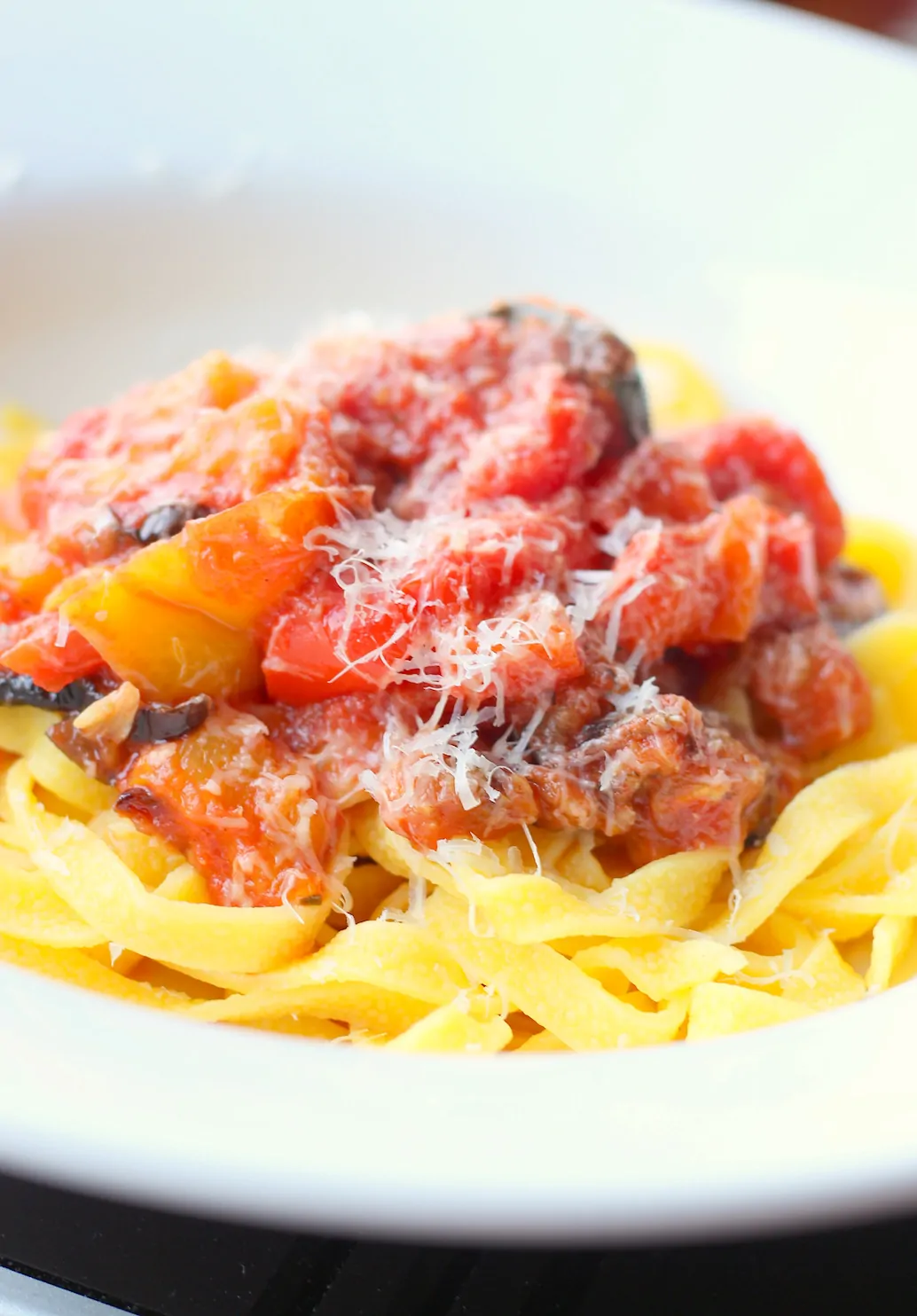 Als de groenten klaar zijn, hak je ze grof. Roer daarna door de tomaten heen en proef. Breng op smaak met peper en eventueel nog een klein snufje kruiden of zout. Het is ook erg lekker om er dan nog wat verse basilicum door te roeren. Serveer de tagliatelle met de groentesaus en rasp er wat Parmezaanse kaas over.