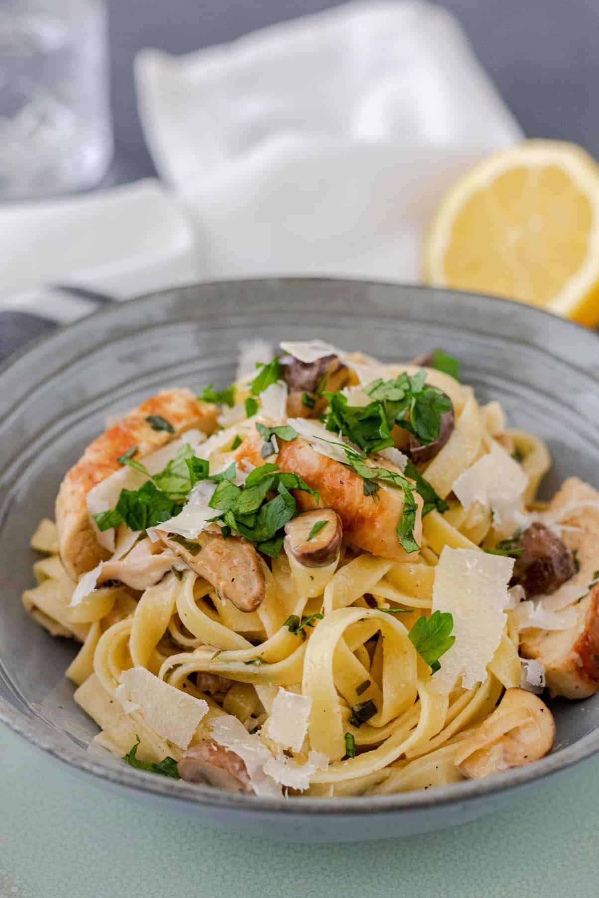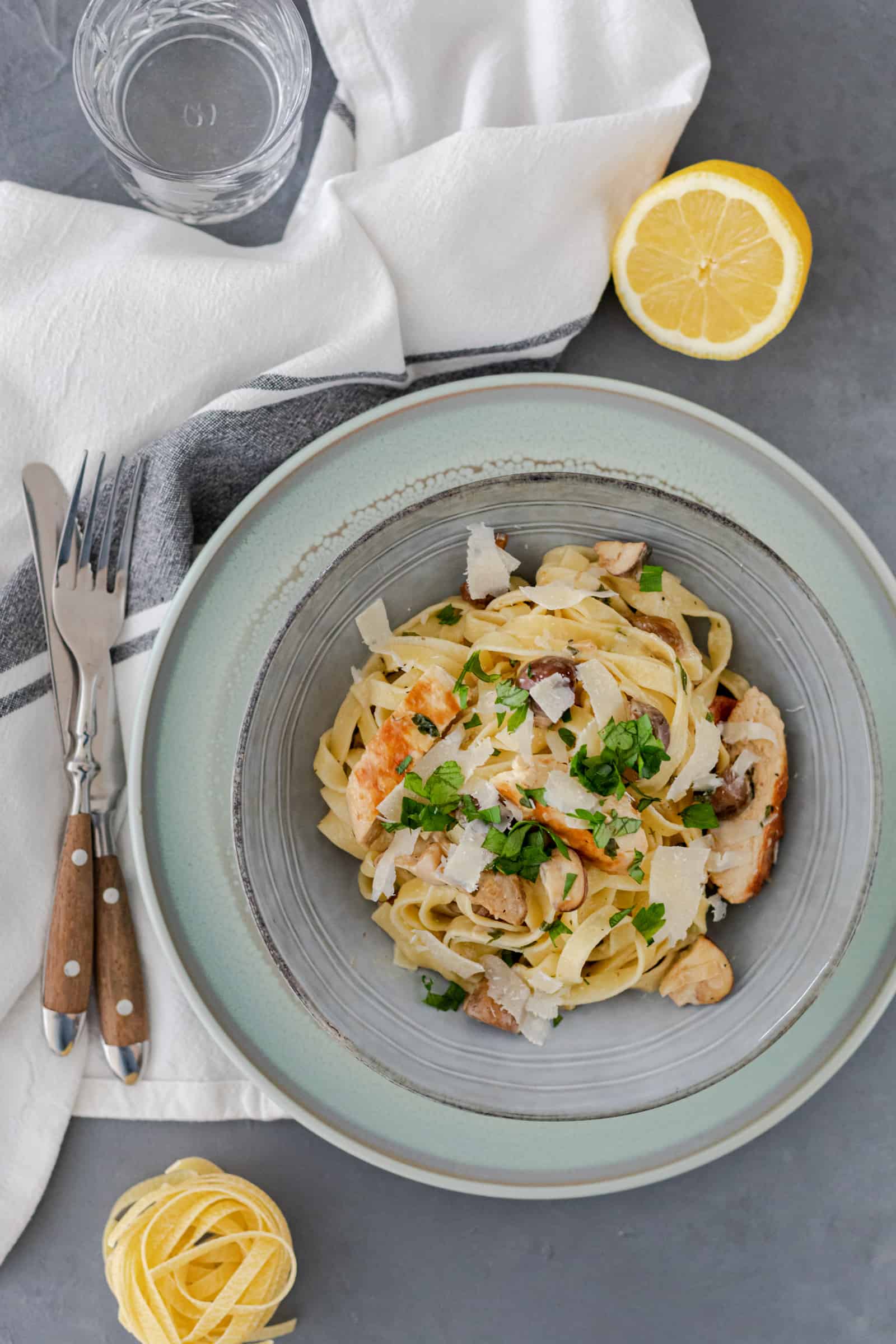 - Serveer de tagliatelle met paddenstoelen en kip op diepe borden en garneer met extra platte peterselie, grof geschaafde Parmezaanse kaas en nog een snufje zwarte peper.