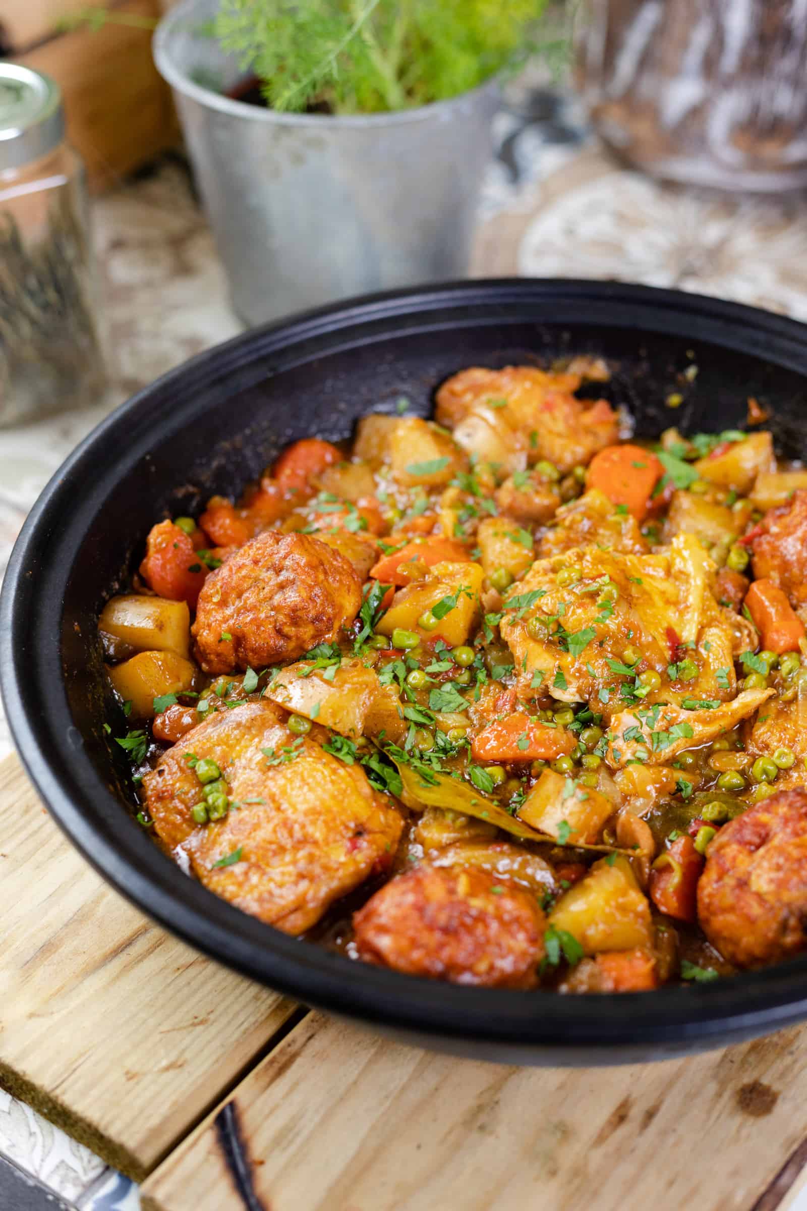 - Haal de tajine met kip van de barbecue en zet deze in het midden op tafel. Schep ‘m nog een keer door, bestrooi met fijngehakte peterselie en laat iedereen zelf opscheppen. Geniet van het samen buiten eten!