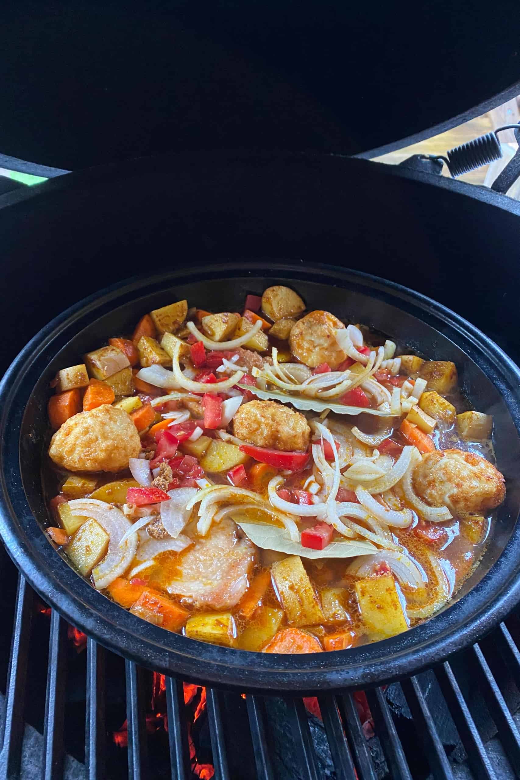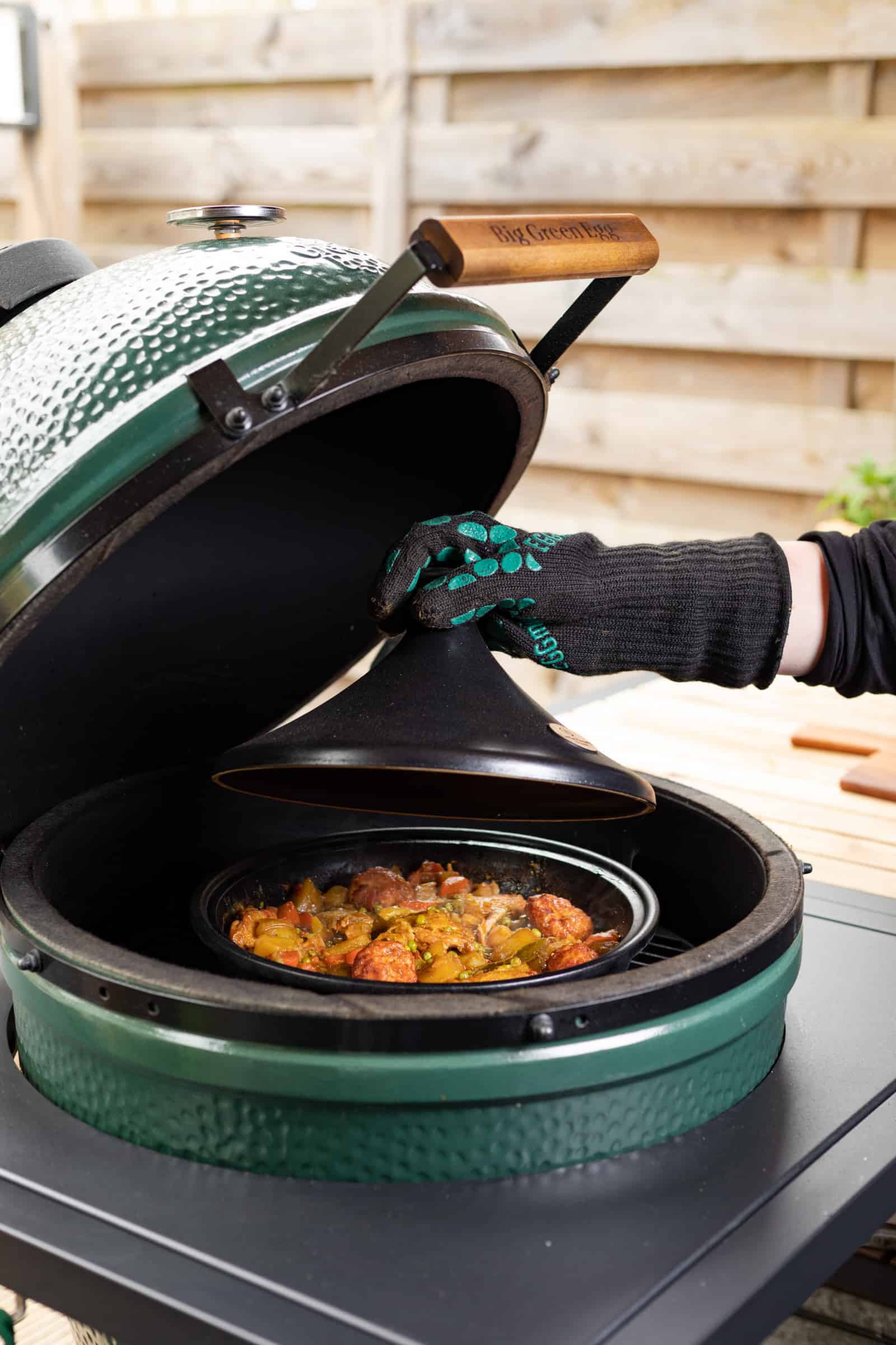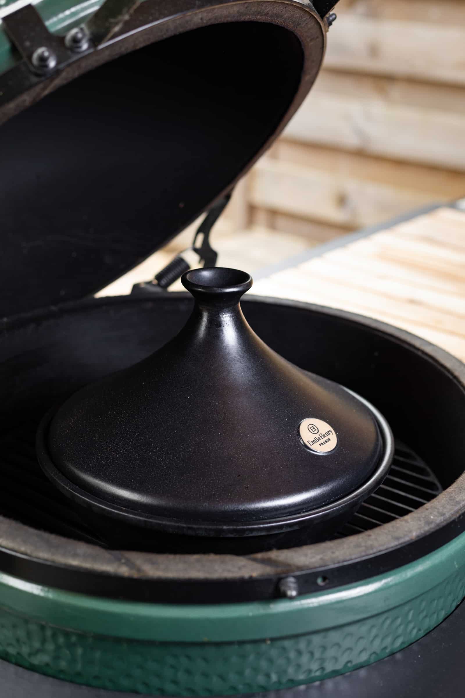 Wij hebben trouwens een flinke kamado in de tuin staan, maar dat betekent niet dat je die automatisch nodig hebt als je buiten gaat koken. Als je maar een deksel op je barbecue hebt en kunt spelen met de hitte van de kolen. Want voor sommige gerechten heb je directe hitte van de kolen nodig en voor sommige gerechten wil je wel hitte, maar niet direct onder je gerecht. Dan kies je voor een hitteschild, of je verschuift de kolen naar een andere kant. Verder hebben wij een echte tajine van geglazuurd aardewerk gebruikt. Mocht je die in huis hebben dan kun je die op je eigen barbecue gebruiken, check wel eerst even of het allemaal past onder het deksel. En zorg ervoor dat je de tajine (leeg) alvast in de barbecue zet als deze aan het opwarmen is. Zo kan je tajine ook geleidelijk warm worden.