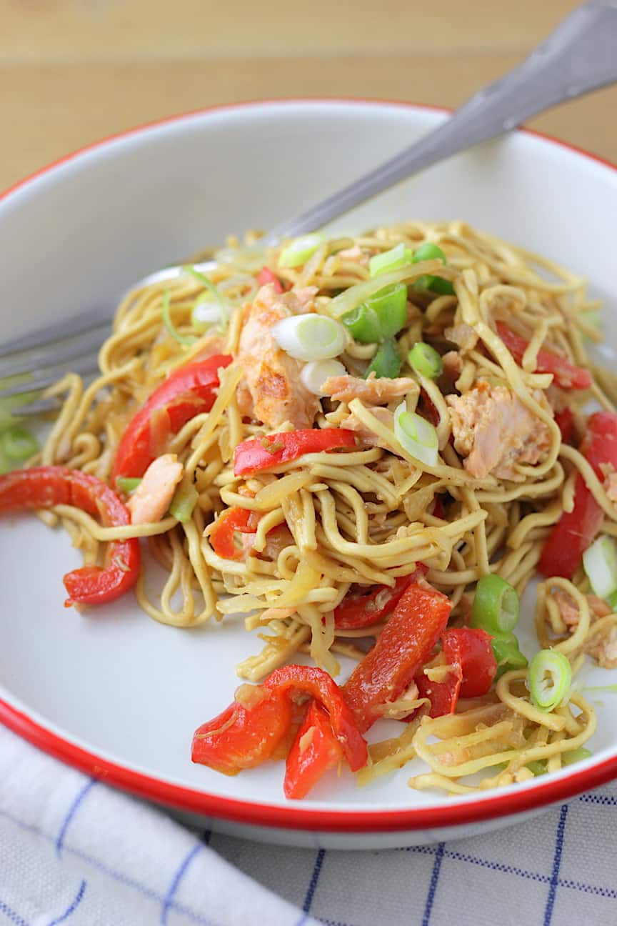 In dit gerecht combineerde ik mijn teriyakisaus (je kent’ m wel van dit recept) met noedels, groenten en zalm. En dat werd een heerlijk maaltje!