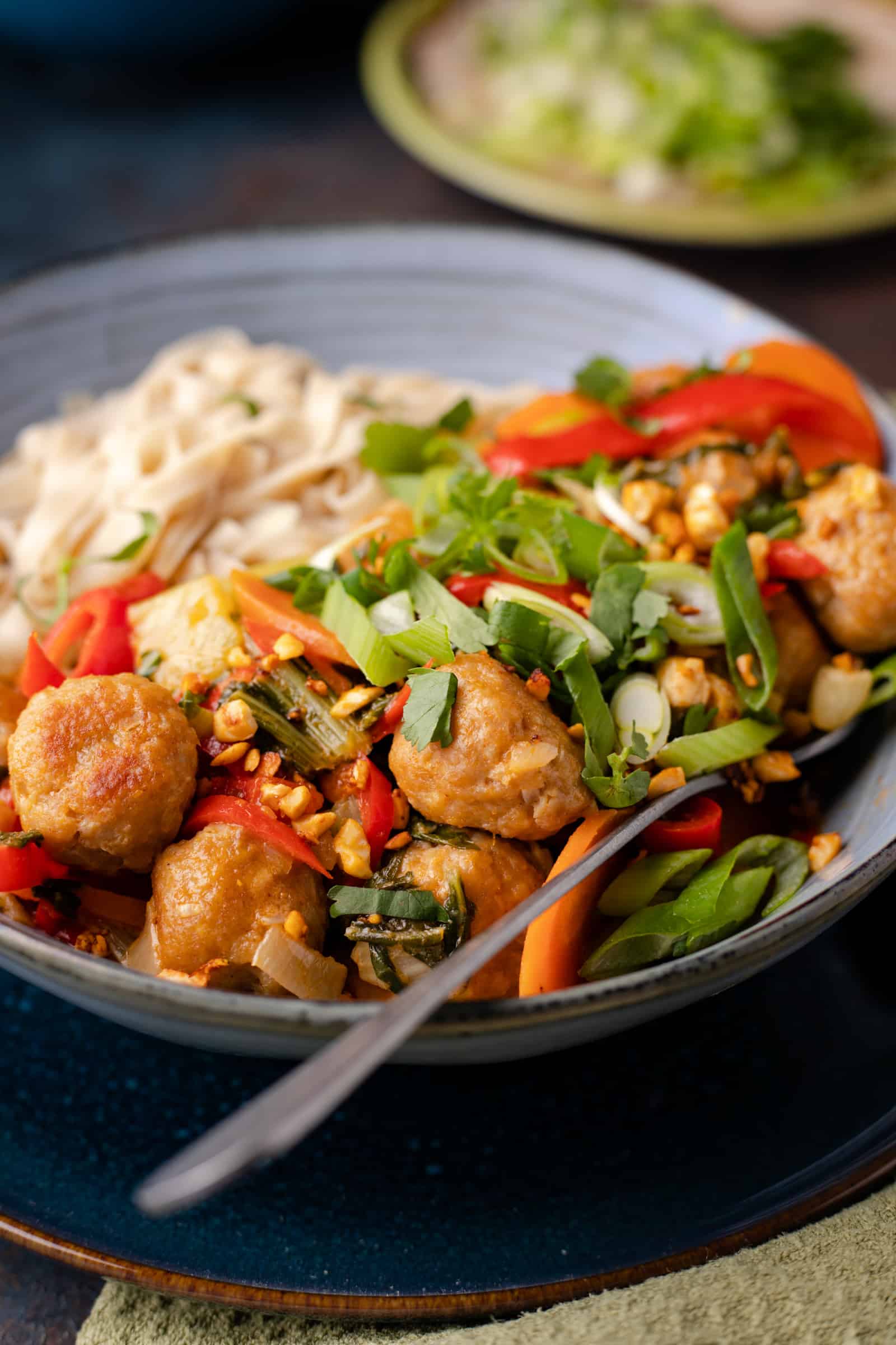 - Serveer de Thaise curry met de bruine rijstnoedels en garneer met het cashewkruim en lente-ui en/of koriander naar keuze.