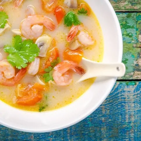Schep de paddenstoelen met de reepjes peper en gember door de soep. Na 5 minuten gaan de garnalen erbij. Proef 3 minuten later en breng op smaak met vissaus, limoensap en -rasp. Serveer met ringetjes bosui en gehakte koriander of peterselie.