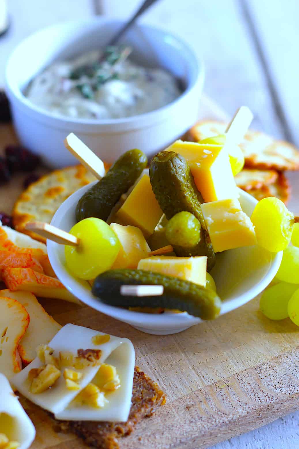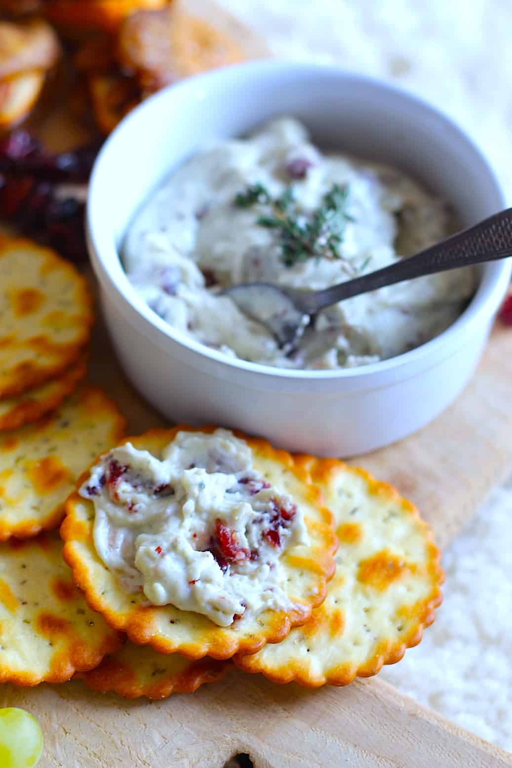 Deze dip van blauwe kaas is onze eigen favoriet van de kaasplank. De blauwe kaas is op deze wijze niet te overheersend en tegelijkertijd proef je ‘m toch goed. Door de tijm krijgt het wat extra pit en de cranberries geven ‘m een zoetje. Heerlijk! Met deze dip is je kaasplank sowieso al geslaagd.