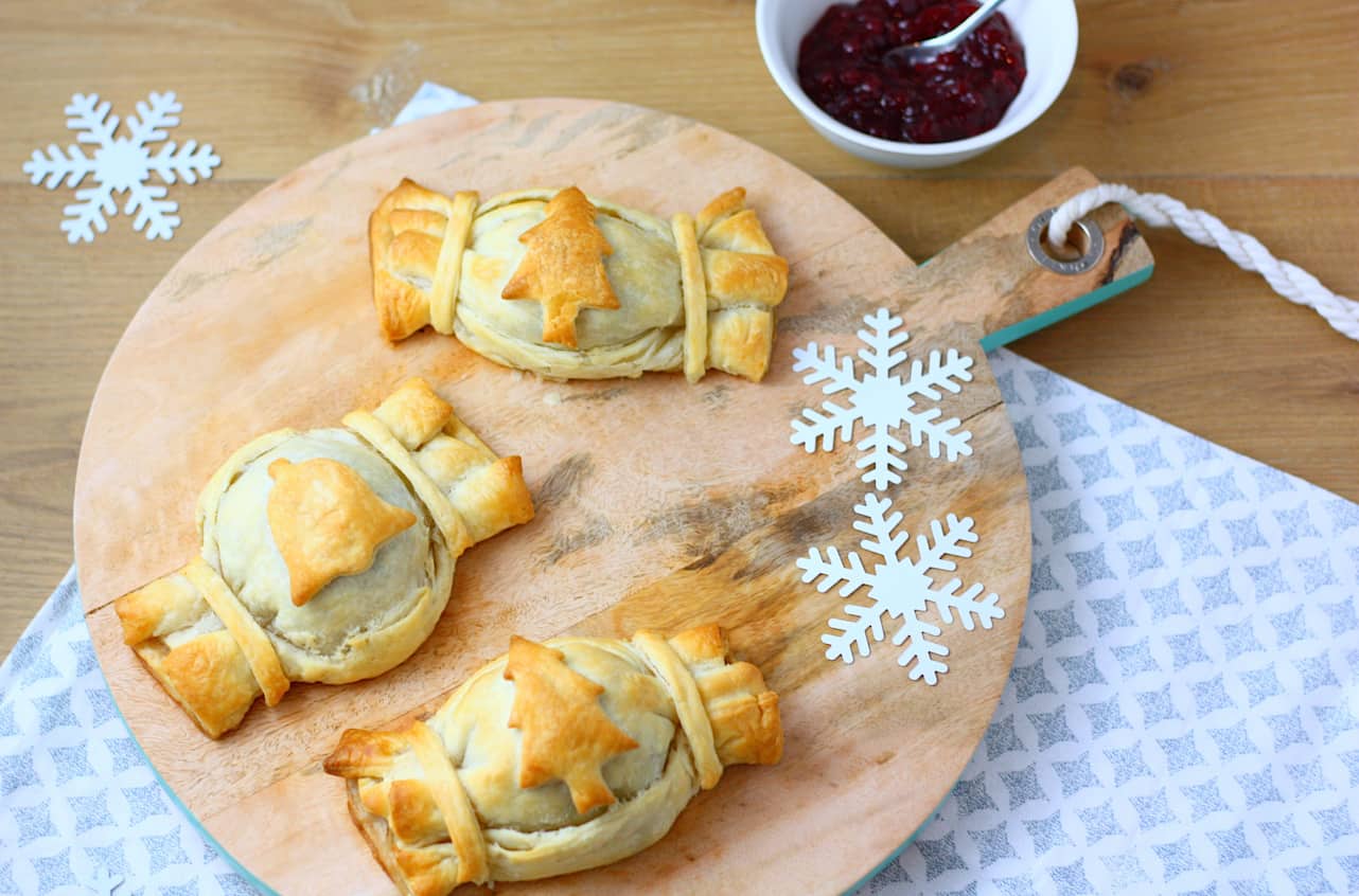 Herhaal dit alles met je 2e rol bladerdeeg totdat je 4 cadeautjes hebt. Deze pak je vervolgens voorzichtig in vershoudfolie en leg je in de vriezer tot gebruik. Ideaal voor de kerstdagen, want je kunt ze al een week eerder maken. Op de dag van het kerstdiner verwarm je de oven voor op 200 graden. Leg de cadeautjes op bakpapier in de oven en bak ze 30-35 minuten totdat de bovenkant goudbruin is. Wil je absolute zekerheid, steek dan een kerntemperatuurmeter in het midden van 1 pakketje en haal ze eruit als deze 45 graden aangeeft. Laat nog 10 minuten rusten en serveer.