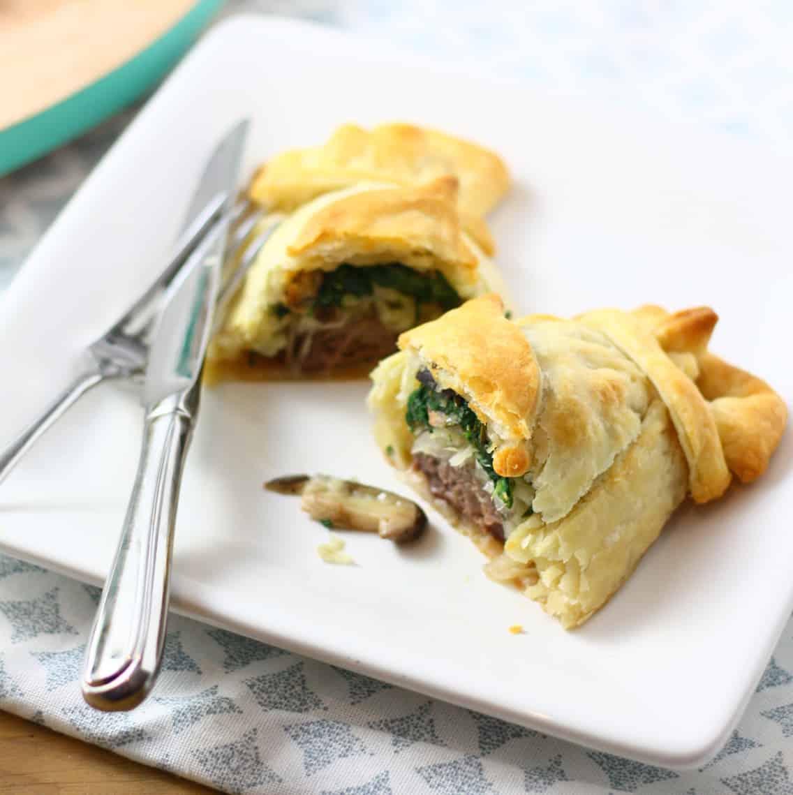 Haal 1 rol bladerdeeg uit de koeling en laat 5 minuten op temperatuur komen. Rol daarna uit en snijd aan de zijkant 1 strook eraf waar je 2 sterren (of andere kerstvormpjes) kunt uitsnijden met een vormpje. Snijd de rest in 4 gelijke vierkanten. Leg 1 stuk ossenhaas op een vierkant en schep daar een 1/4 van het spinaziemengsel op. Je kunt ook een deel onder het vlees leggen en nog een deel erboven. Vouw de boven- en onderkant van het bladerdeeg over het vlees en leg daarna een 2e plak bladerdeeg erover. Knijp de zijkanten met beleid dicht. Alsof je een cadeautje ervan maakt. Zet een kommetje met koud water naast je en plak met vochtige vingers alle randjes goed dicht. Herhaal dit met je 2e cadeautje. Steek 2 versieringen uit de strook bladerdeeg en leg die bovenop het cadeautje. Snijd daarna nog 4 dunne reepjes en leg die over de zijkanten die je hebt ingedrukt. Knijp dit, wederom met beleid, dicht en ‘plak’ vast met water.