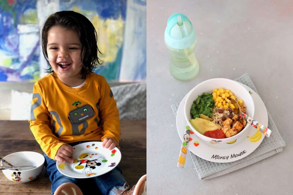 Servies in vrolijke kleuren of met leuke motiefjes helpt daarbij ook goed. Zo is onze peuter dol op zijn Mickey Mouse servies van WMF. En ja, ik laat hem gewoon van porselein eten, laat ze daar maar zo vroeg mogelijk aan wennen. Zo ook aan eten met bestek. Prikken met een vork vindt hij fantastisch, zeker nu hij alles “zelluf!” wil doen en daardoor eet hij ook beter.
