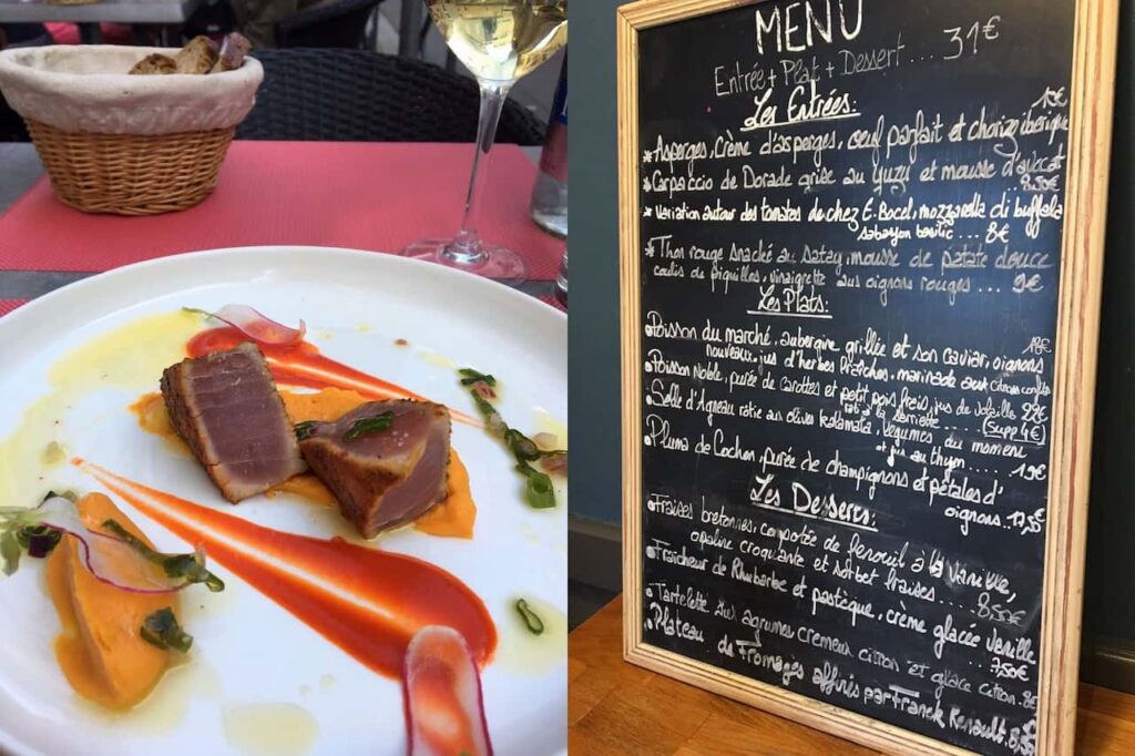 De tweede avond at ik bij restaurant L’Atelier des Gourmets. En ook over dit restaurant ben ik erg enthousiast. Het was heel anders dan het eerste restaurant, want hier waren de tafels netjes gedekt, komt de sommelier je meer vertellen over de wijn, zijn de gerechten heel mooi opgemaakt en klinkt er subtiel een Frans muziekje door het restaurant. Dat geeft natuurlijk direct een andere beleving.