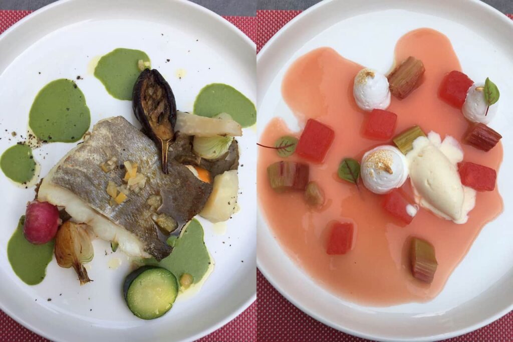 Ook de gerechten waren heel anders. Als voorgerecht at ik gegrilde tonijn met een mousse van paprika en vinaigrette, mijn hoofdgerecht was Poission du Marché (kabeljauw) met gegrilde groenten en kruidendressing en als dessert kreeg ik vanille ijs, meringue, rabarber en watermeloen. Al deze gerechten klinken heel simpel, maar waren juist om die reden zo goed. Ik kan het erg waarderen als ik proef wat ik zie en dat was nu zeker het geval. Pure smaken, verse producten en een goede bereiding en veel meer heb je eigenlijk ook niet nodig.