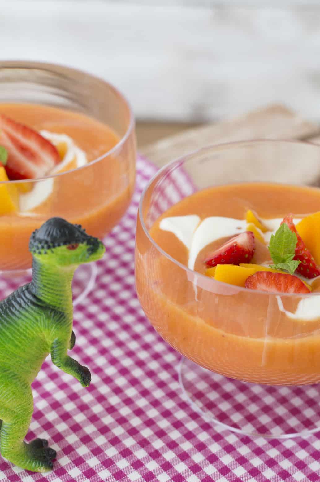 In mijn zoektocht naar verantwoorde toetjes voor doordeweeks maakte ik een keer dit zalige toetsoepje van aardbei en mango voor mijn mannen. Het werd een blijvertje en kwam daardoor ook als recept in mijn boek Mag ik nog een hapje. Je maakt ‘m heel makkelijk met vers, zoet fruit, yoghurt en een drupje balsamicoazijn voor de smaak.