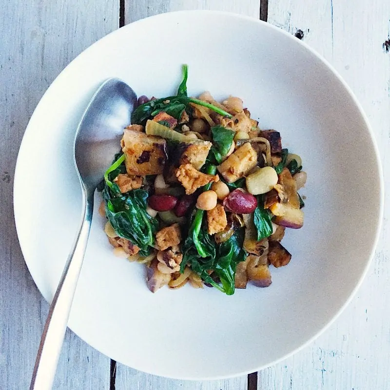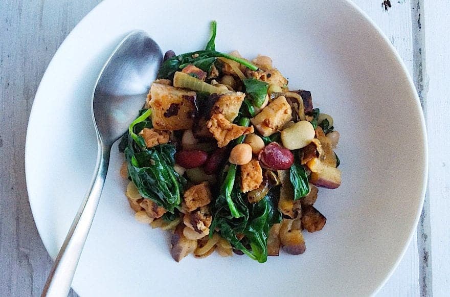 Gisteren vertelde ik jullie al over de nieuwe Tofu à la minute van SoFine. Die probeerde ik vorige week voor het eerst uit en maakte binnen 15 minuten een heerlijk gerecht met restjes groenten die ik nog in de koelkast had liggen. Deze tofu roerbak met aubergine en spinazie was zo verrassend lekker dat ik het recept wel moet delen. Niet alleen heb je supersnel een heerlijk maaltje op tafel staan voor je hele gezin (mijn kleine jongen at gretig zijn bord leeg), je kookt ook nog eens een avondje zonder vlees. En daar worden we, inclusief onze aarde, allemaal een beetje beter van.
