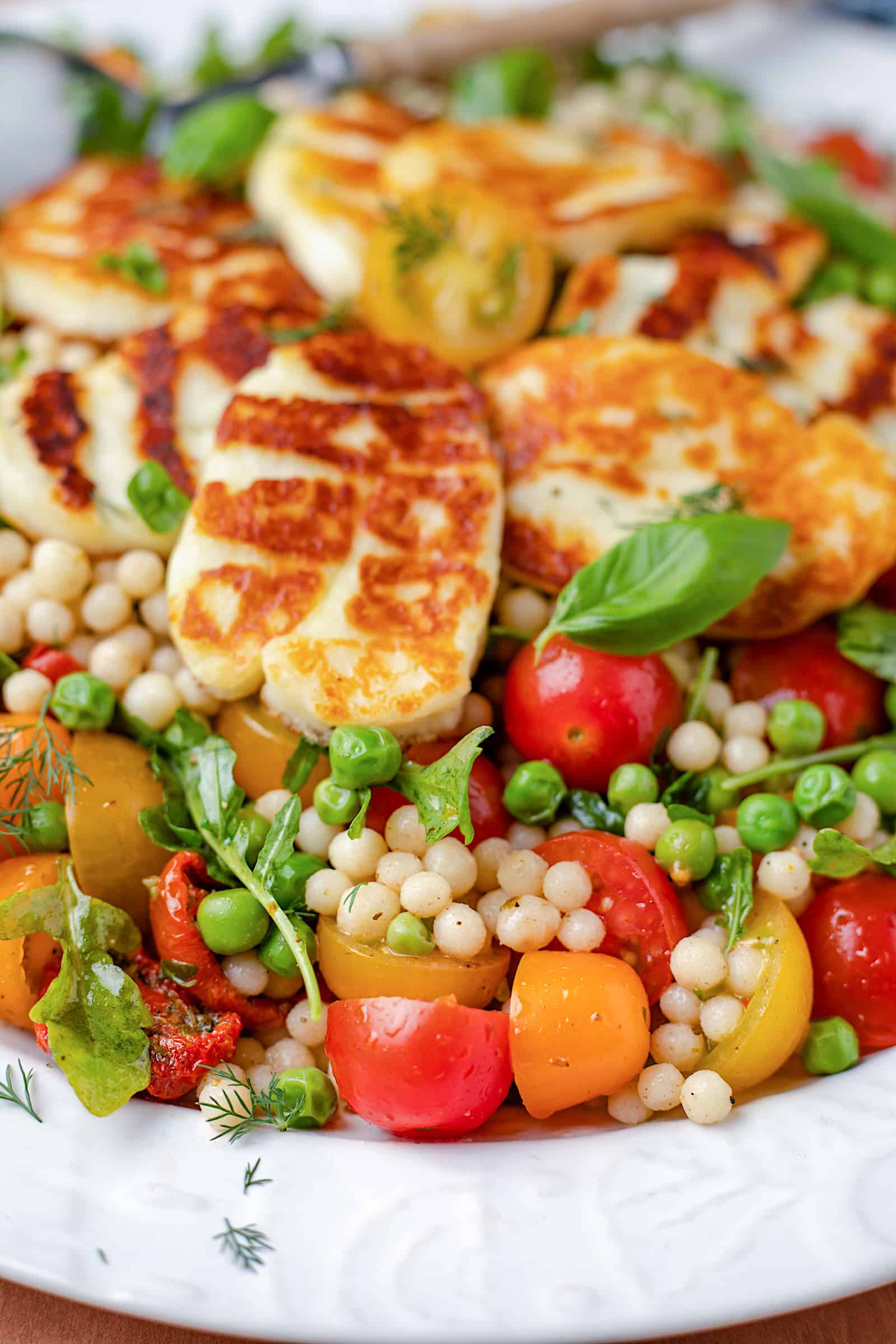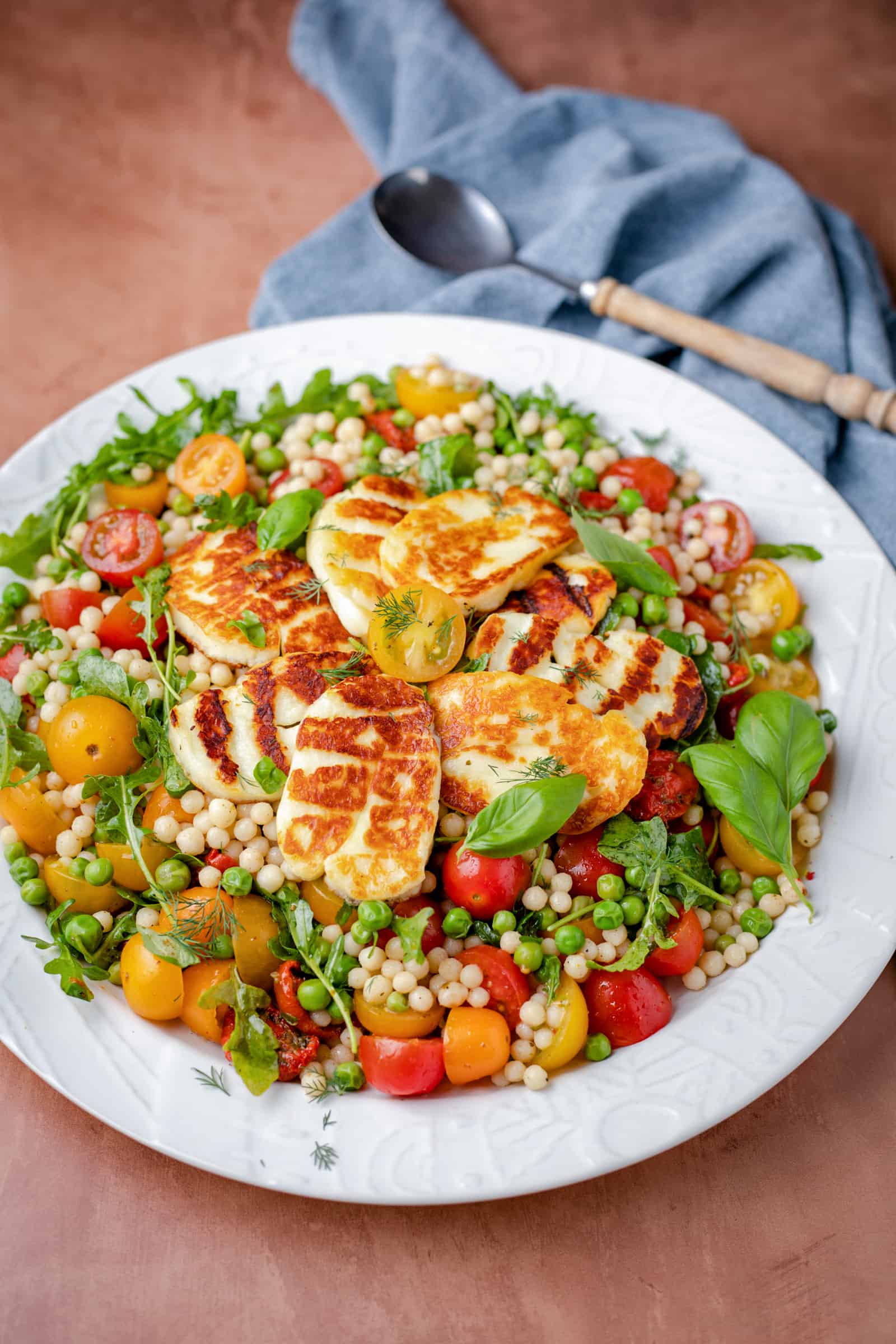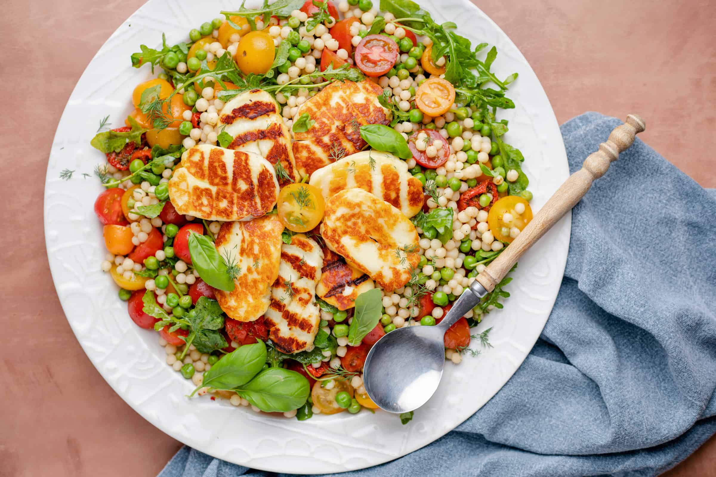 Deze tomatensalade valt voor mij in de categorie ‘snel klaar en barst van de smaak’ en als ik iets fijn vind in de zomer is het wel een maaltijdsalade als deze. Terwijl de parelcouscous aan het koken is, snijd je de cherrytomaten en grill je de plakken halloumi. Alleen nog even de salade samenstellen en in 20 minuten kun je aan tafel.
