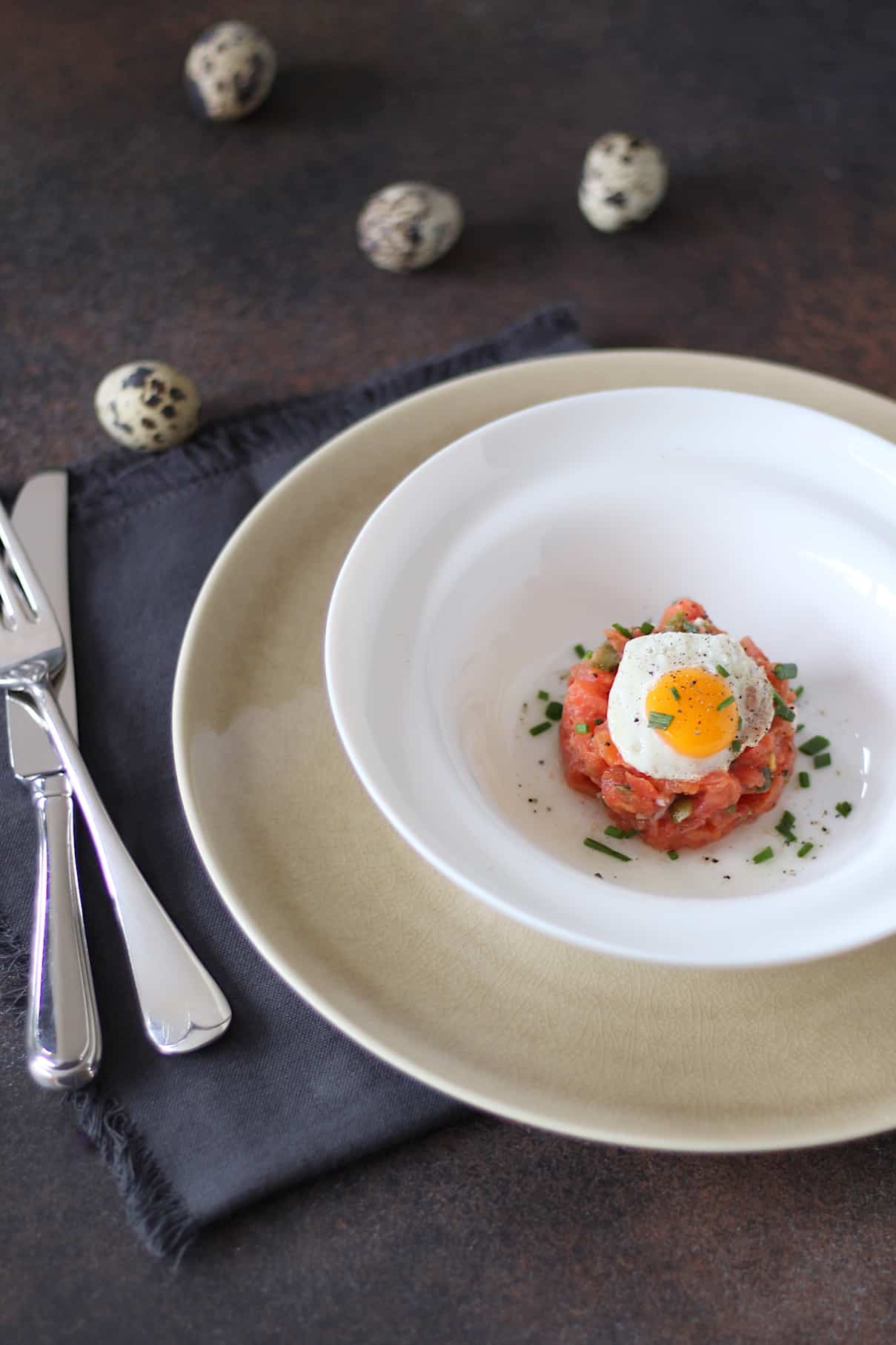 5. Maak 4 bordjes op met een torentje van de tomatentartaar. Daarvoor kun je ook een uitsteker gebruiken. Leg op ieder torentje een kwartelei, garneer met fijngehakte bieslook en serveer direct.