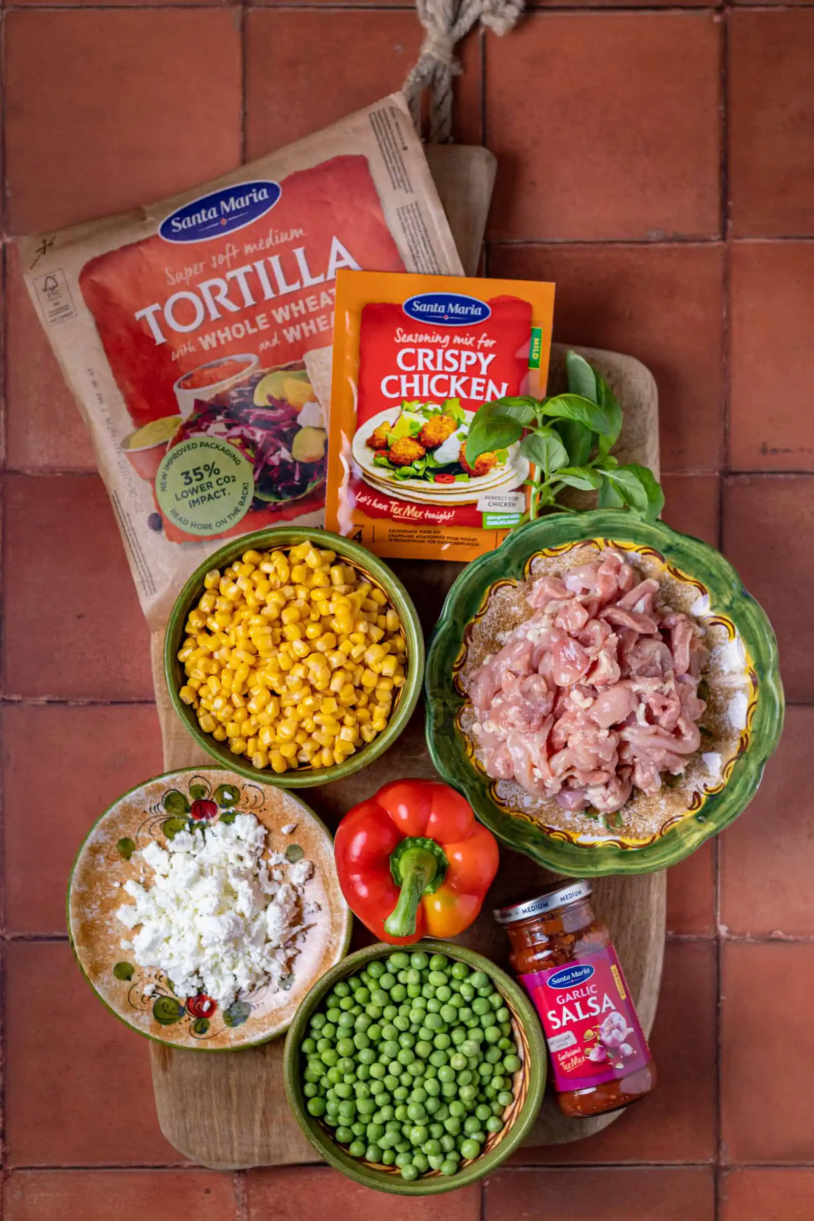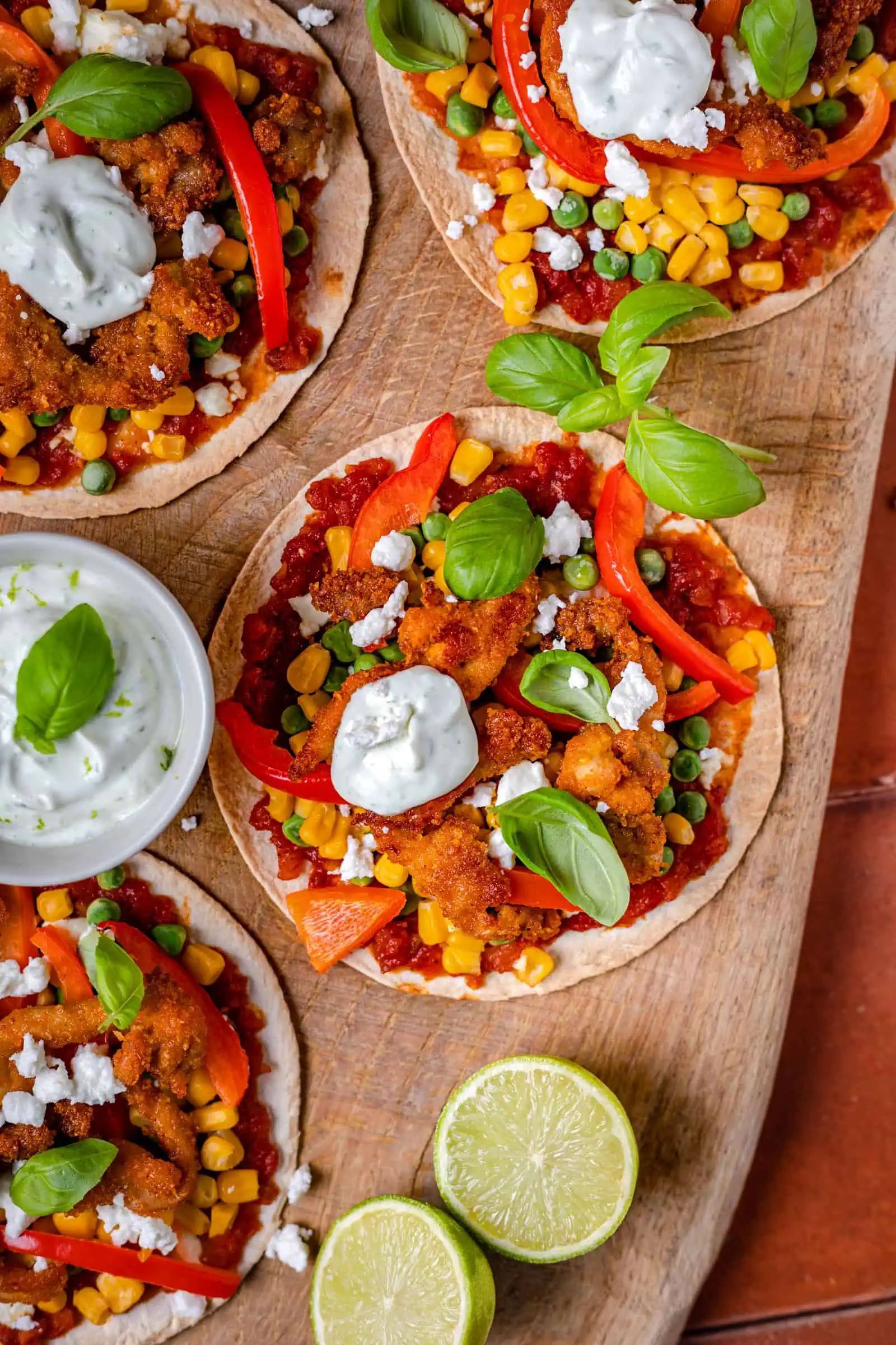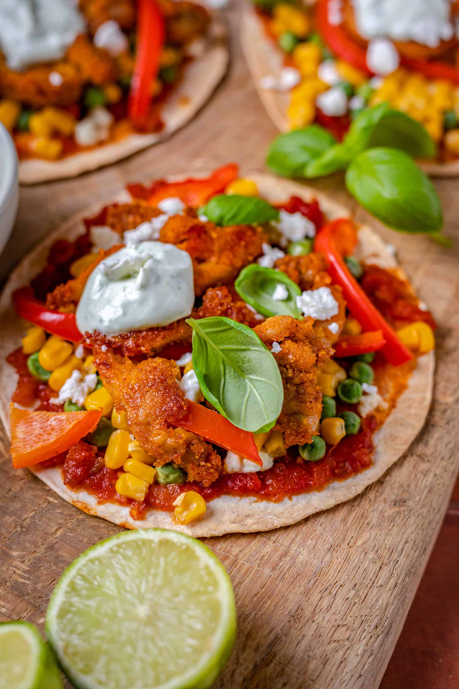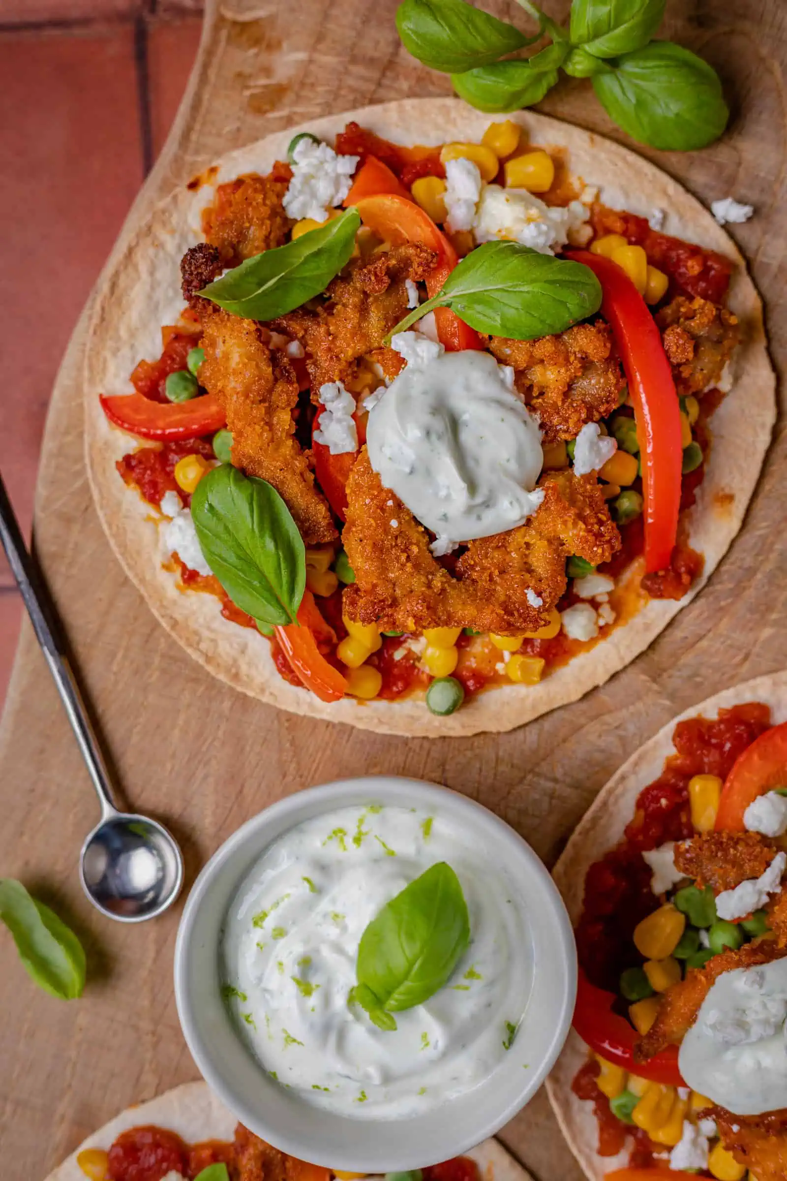 Qua groenten koos ik voor rode paprika, doperwten en mais. Maar je kunt daar uiteraard mee variëren. Ook courgette, lente-ui en broccoli doen het goed op deze tortilla pizza’s. En als je ze vegetarisch wilt eten vervang je de krokante kip voor krokante bloemkool. En qua kruiden voegde ik eens geen koriander, maar basilicum toe. Wat heerlijk smaakte!
