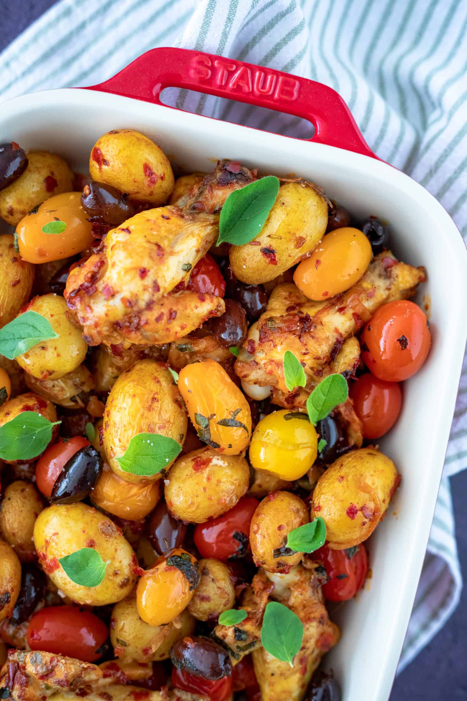 - Garneer de traybake met kip, krieltjes en rozenharissa daarna met extra oregano en serveer.