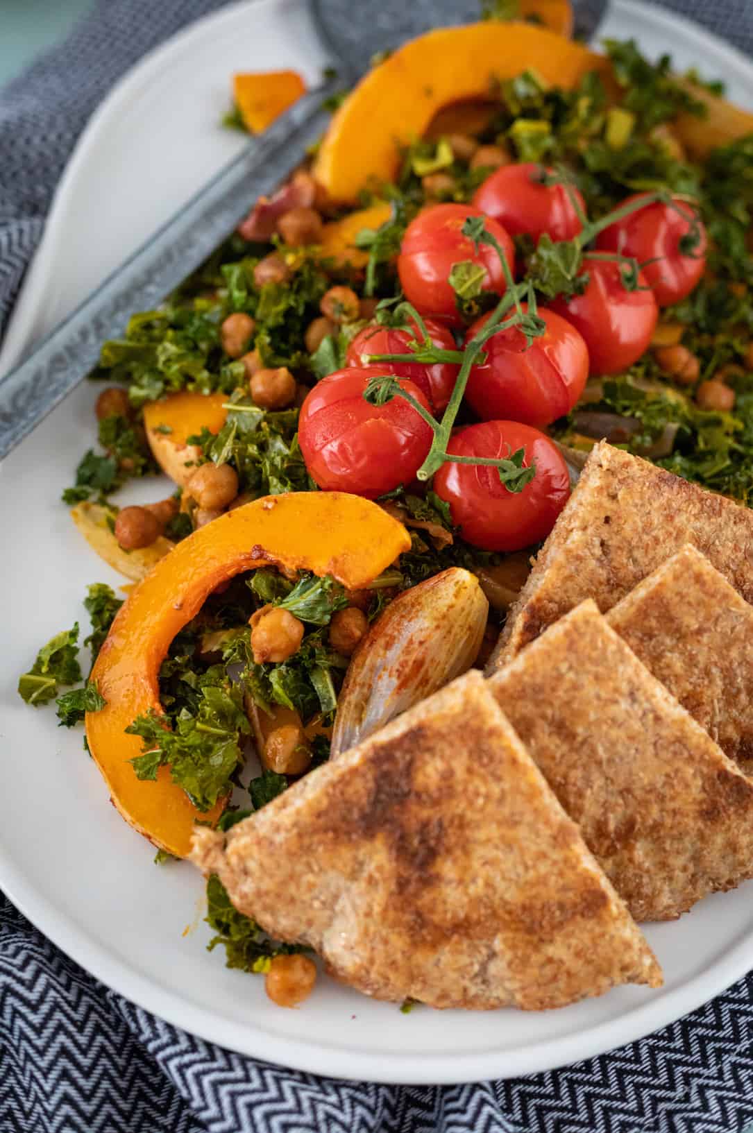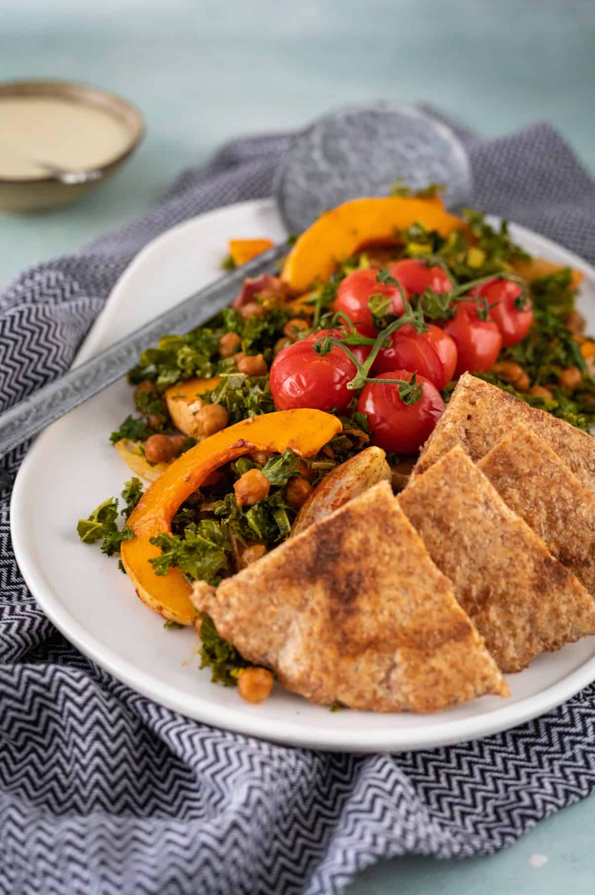 - Serveer de traybake met pompoen, boerenkool en kikkererwten met de pitachips en tahindressing.