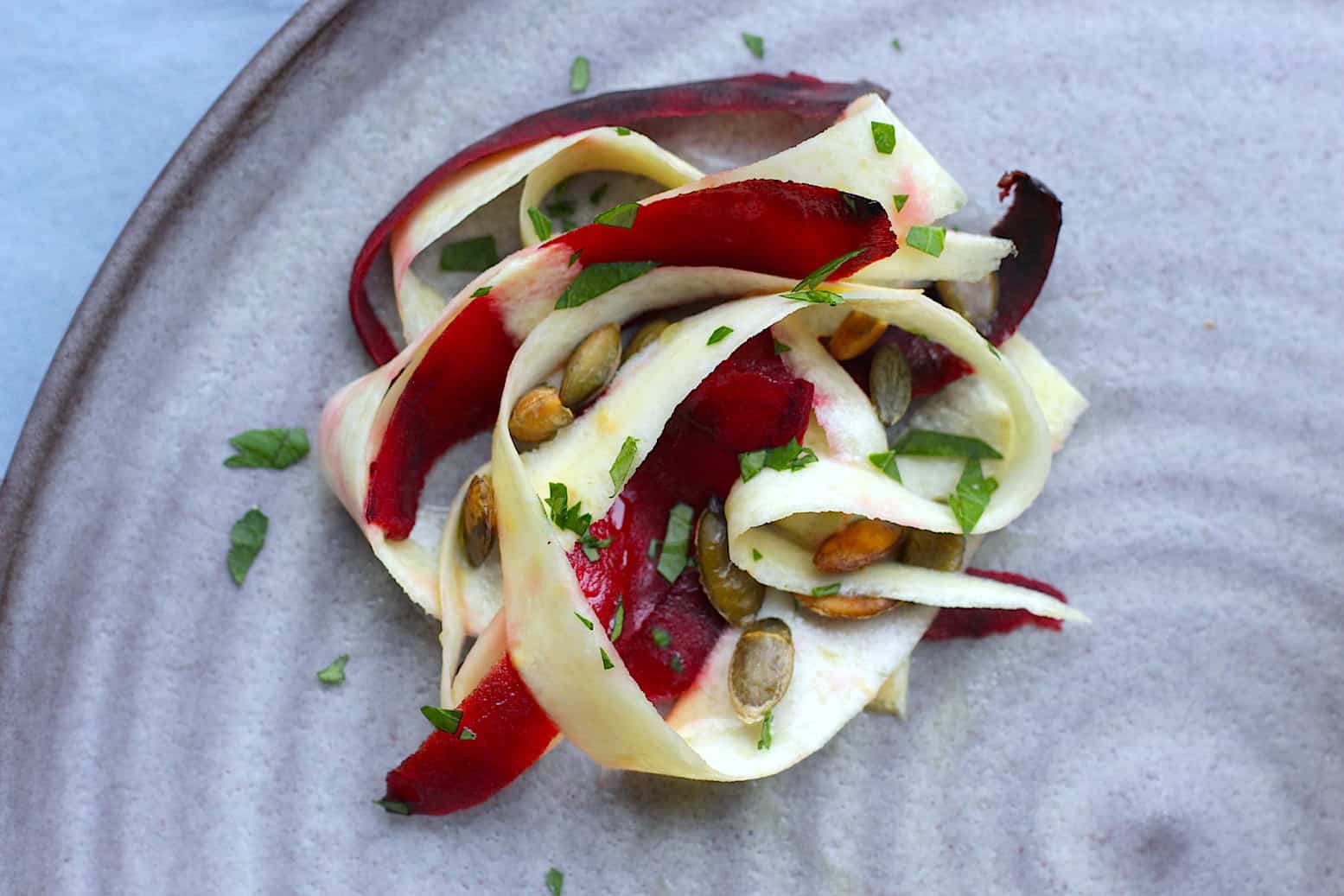 Salade met geschaafde pastinaak, biet en pompoenpitten