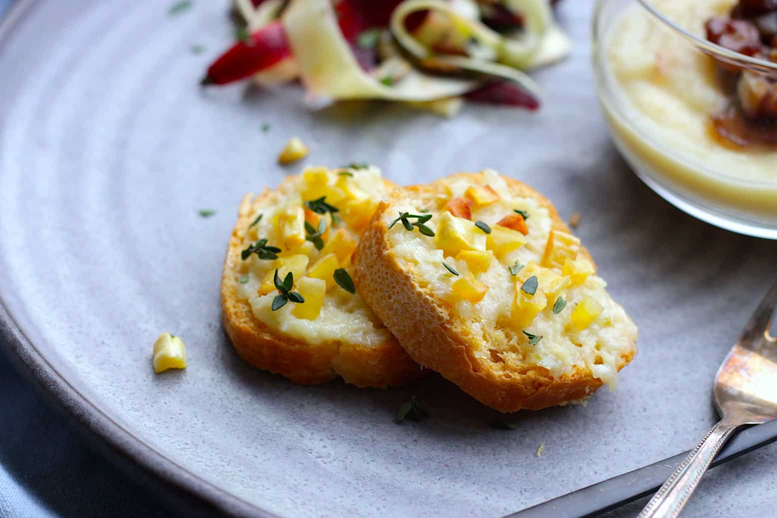 - Laat de knoflook afkoelen en bak nu eventueel het brood nog af. Je perst de knoflook puree zo uit de knoflookbol met je vingers. Smeer hiervan een dun laagje op elke crostini en verdeel hier de pastinaakblokjes over. Maak het af met wat tijm en verdeel twee crostini’s per persoon.
