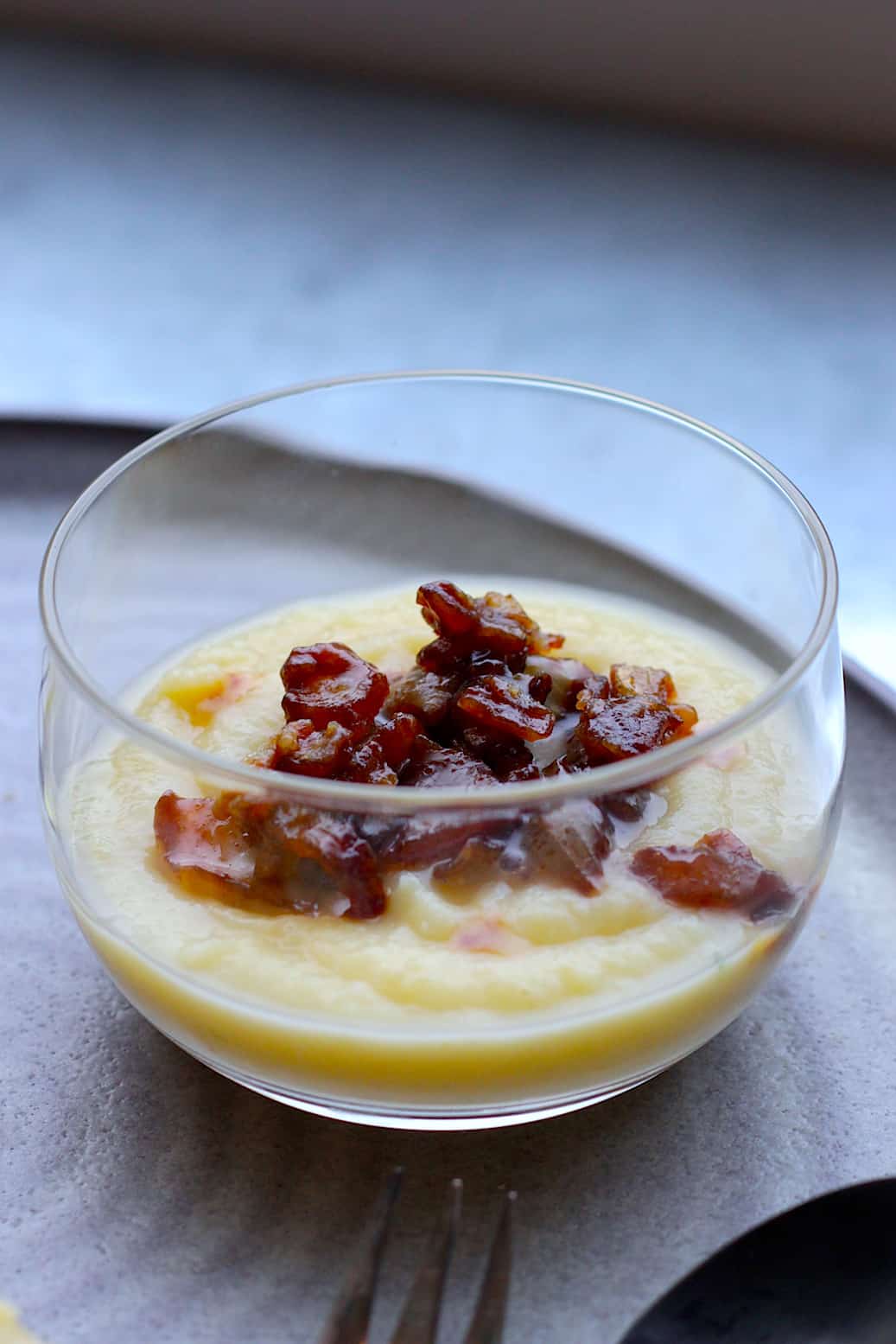 - Pureer de soep voeg eventueel nog wat extra bouillon toe mocht je de soep te dik vinden (een beetje dik is deze soep juist lekker, vinden wij). Proef en breng op smaak met peper. Schenk in glaasjes en schep daar de gekarameliseerde uitjes op.