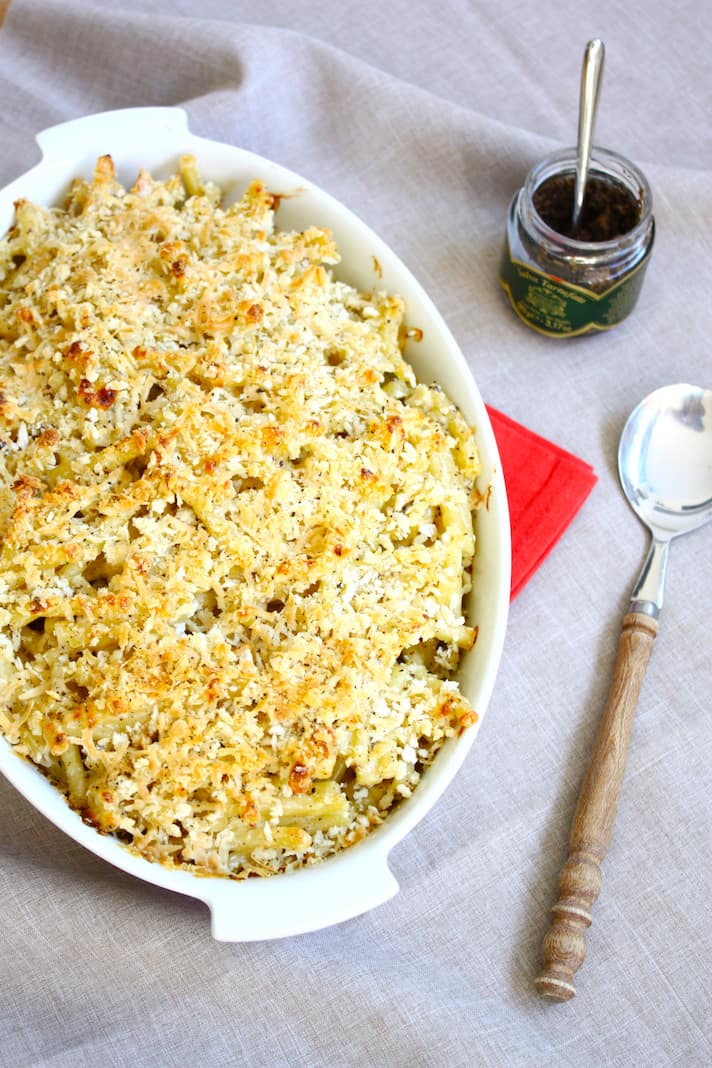 Romige mac & cheese en dan ook nog eens met truffel. Toen ik dit at op het Engelse platteland sloeg mijn hart een paar keer over. Ik wist gelijk dat dit een geweldig bijgerecht voor het kerst hoofdgerecht zou zijn en ging thuis aan de slag. Met de onovertroffen truffel tapenade uit de kersteditie van de Foodeliciousbox. Het was 10 uur ‘s ochtends en ik at gretig een halve bak leeg als ontbijt tijdens het proefkoken, missie meer dan geslaagd dus.