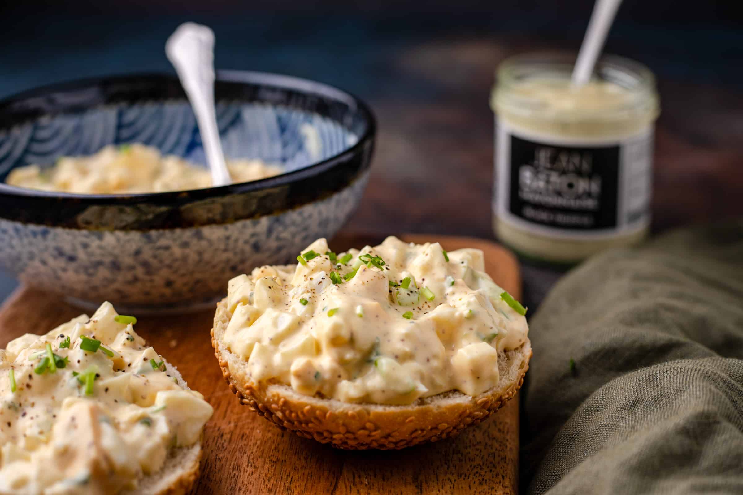 In de truffeleiersalade zit onder andere wat mosterd, sjalot, bieslook en een vleugje witte wijnazijn en natuurlijk hardgekookte eieren. De grootste smaakmaker in dit recept is de zwarte truffelmayonaise en daarvoor kies ik altijd voor Jean Bâton, zij maken wat mij betreft de allerlekkerste truffelmayonaise in het land. Geniet ervan!