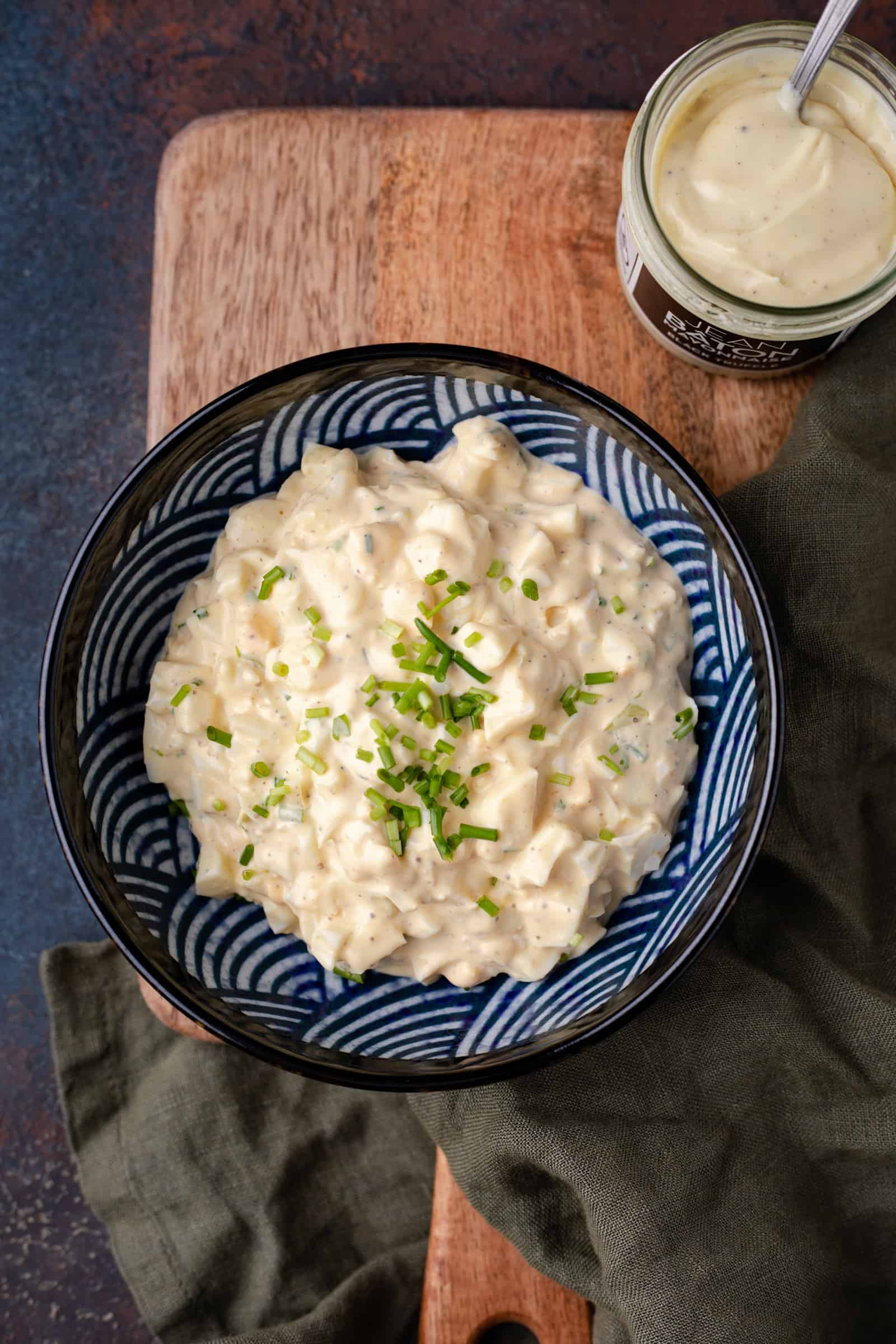 In de truffeleiersalade zit onder andere wat mosterd, sjalot, bieslook en een vleugje witte wijnazijn en natuurlijk hardgekookte eieren. De grootste smaakmaker in dit recept is de zwarte truffelmayonaise en daarvoor kies ik altijd voor Jean Bâton, zij maken wat mij betreft de allerlekkerste truffelmayonaise in het land. Geniet ervan!