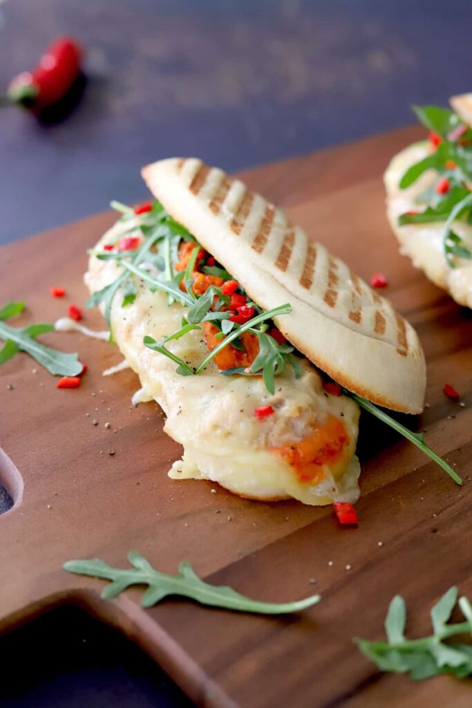 - Snijd de panini broodjes open. Besmeer de onderste helften met een laagje van de paprikaspread. Schaaf plakjes van de jong belegen kaas en leg die over de spread heen. Verdeel hier weer wat tonijn over en eindig met een tweede laag kaasplakjes.