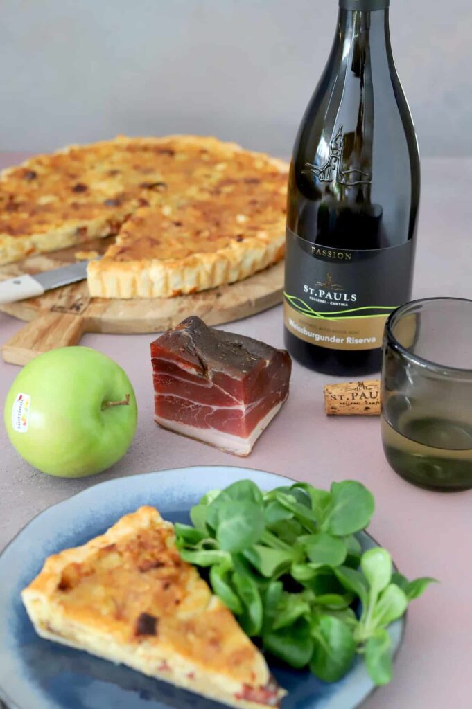 - Laat de quiche daarna 10 minuten rusten en snijd in punten. Serveer met de frisse groene salade en een glas gekoelde Alto Adige DOC Weissburgunder Riserva.