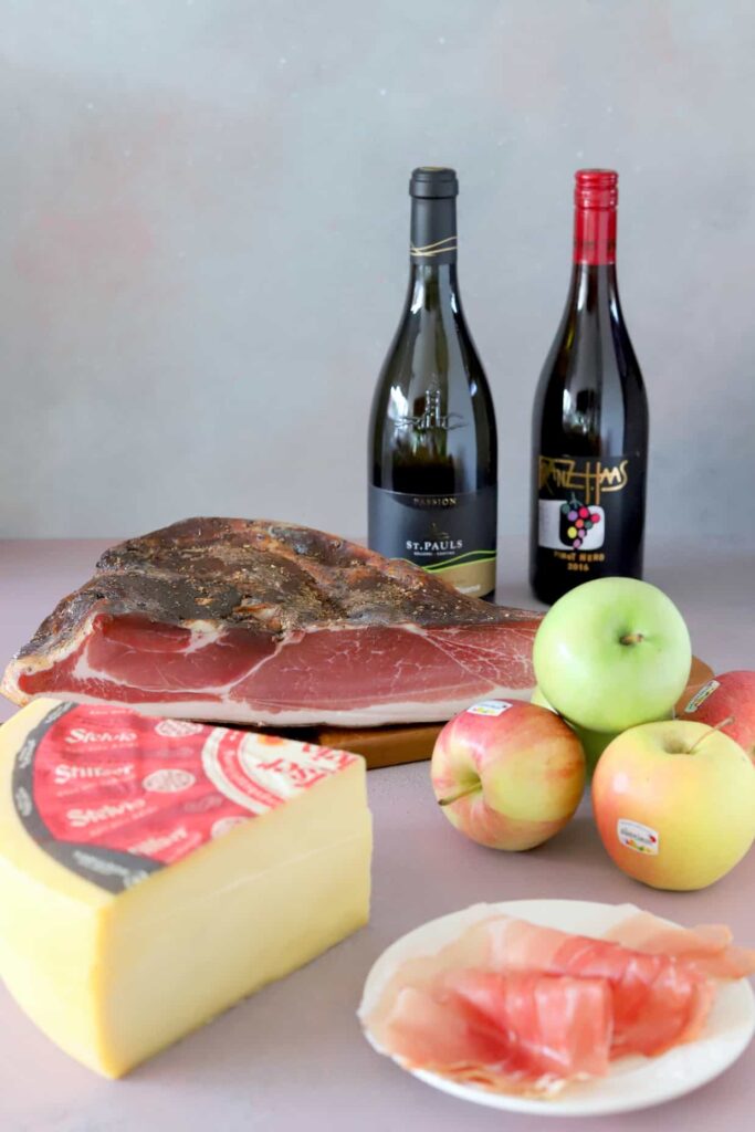 Ik vond het een uitdaging om alle Zuid-Tiroolse producten te combineren in dit tweede recept. En dat is zeker gelukt met de spek, kaas en appels. De witte Weissburgunder Riserva wijn serveerde ik erbij, het werd een waanzinnig ‘klinkend’ kwartet.