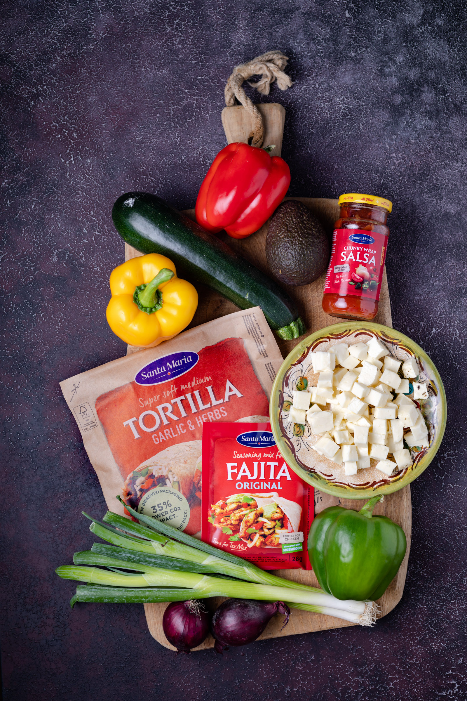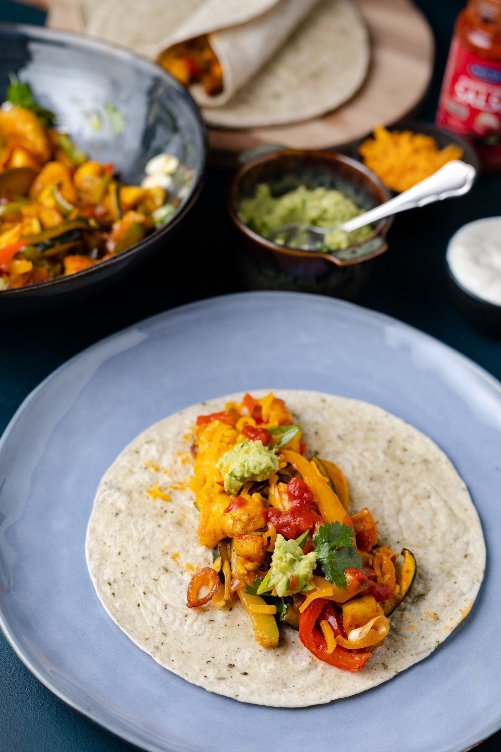 - Dek de tafel met de tortilla wraps en bakjes cheddar, zure room en koriander. Zet ook de chunky wrap salsa op tafel. Als de ovengroenten klaar zijn, schep je ze over in een grote kom en daarover strooi je de ringetjes lente-ui. Zet deze ook op tafel en er kan gegeten worden! Iedereen vouwt zelf zijn fajita's en jij kan mooi vertellen hoe het ook alweer zit met de vouwtechnieken en wanneer iets een fajita, taco, enchilada of burrito is. Eet smakelijk!