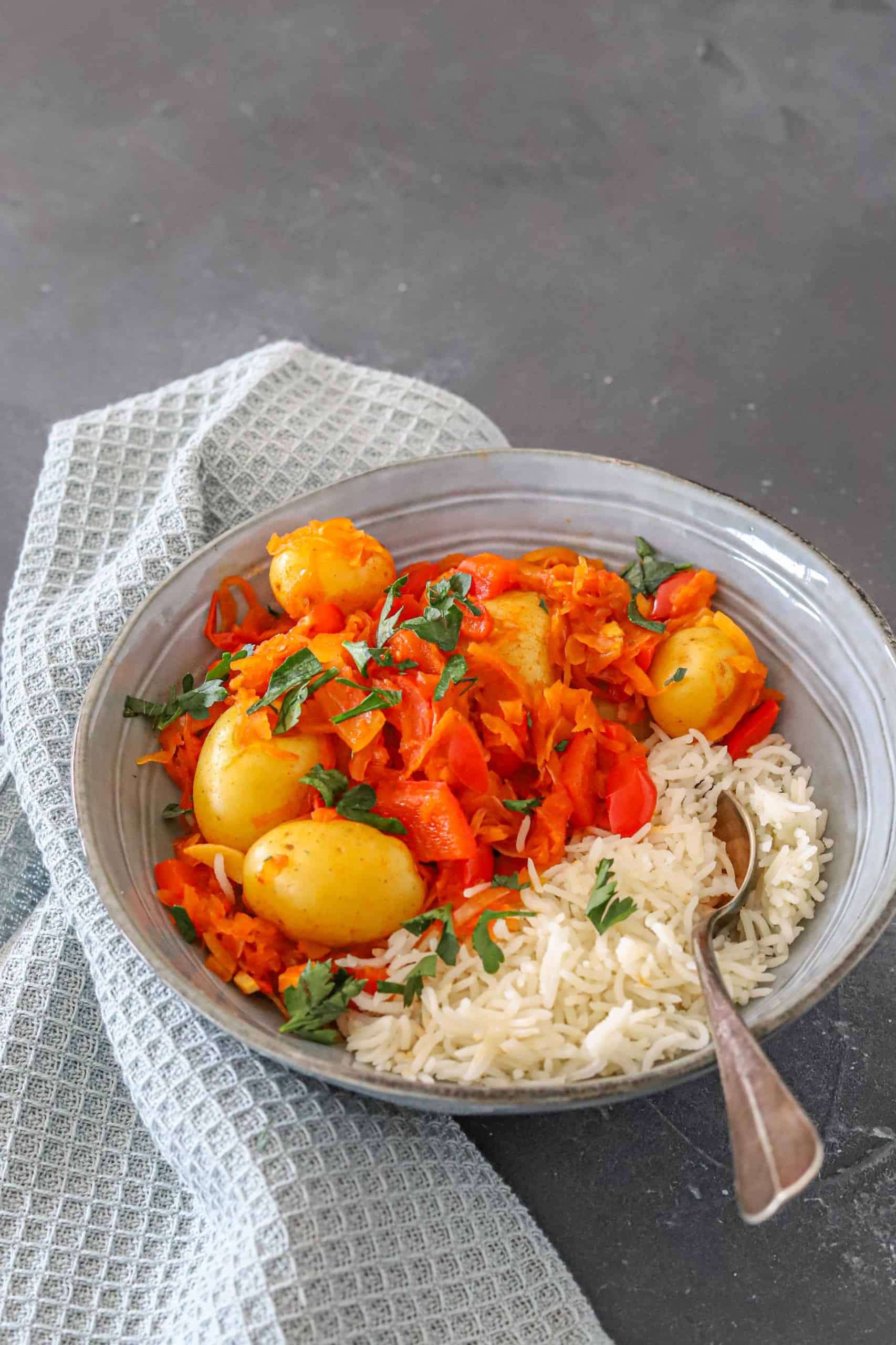 - serveer erbij: witte rijst en grof gehakte platte peterselie