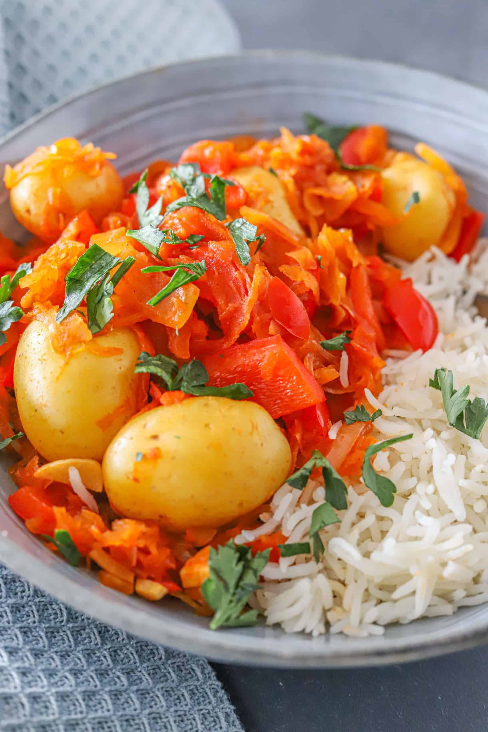 Goulash kun je ook heel goed vegetarisch maken, heb ik ontdekt! Met krieltjes, zuurkool en heel veel paprika (uiteraard) wordt deze vegetarische goulash echt om te smullen. En je maakt ‘m ook nog eens een stuk sneller dan ‘gewone’ goulash. Daarover gesproken: over een paar weken komt mijn recept voor de goulash met rundvlees ook online.