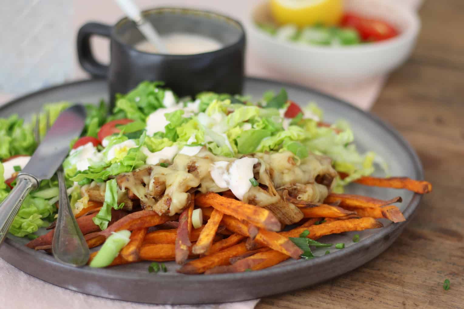 Krokante zoete aardappelfrietjes in de oven maken is trouwens wel een ding. Laten we eerlijk zijn, ze worden nooit zo krokant als uit de frituur. Maar ik heb inmiddels wel wat tips verzameld uit eigen ervaring waardoor je goed in de buurt komt. En mocht je nou wat minder tijd hebben, dan zijn frietjes uit de AirFryer of frituur natuurlijk ook prima. Het blijft nou eenmaal comfort food zo’n kapsalon.