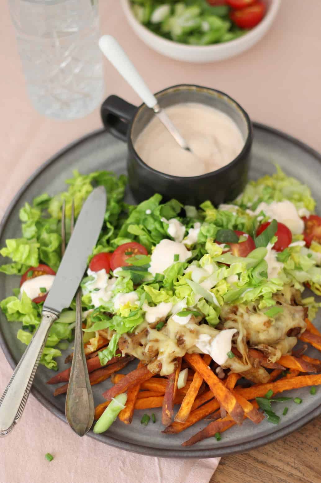 7. Serveer de vegetarische kapsalon direct en zet de overgebleven saus ook op tafel.