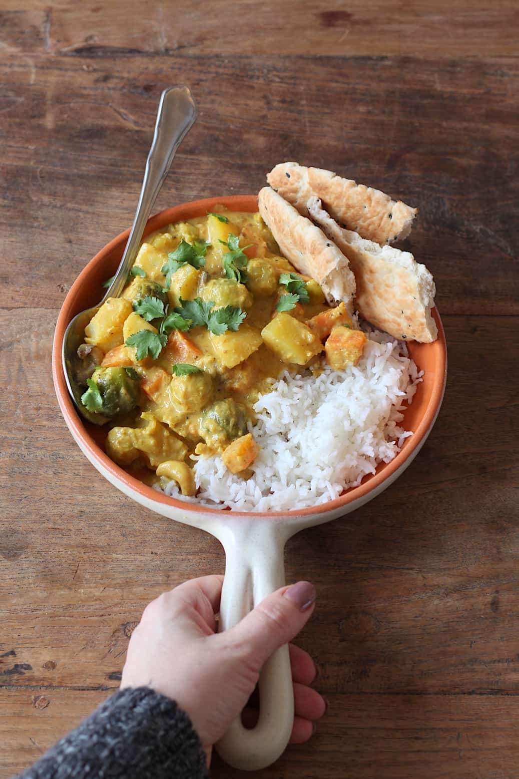 Wel hebben we nu nog te maken met een ‘Siberische’ kou deze week. Ach, dat kan door een dikke trui, jas, handschoen en shawl wel opgelost worden toch? Nog wat verwarmende gerechten erbij en dan komen we deze week prima door! Ik begin de week daarom met deze vegetarische korma met spruitjes waar je zeker warm van zult worden.