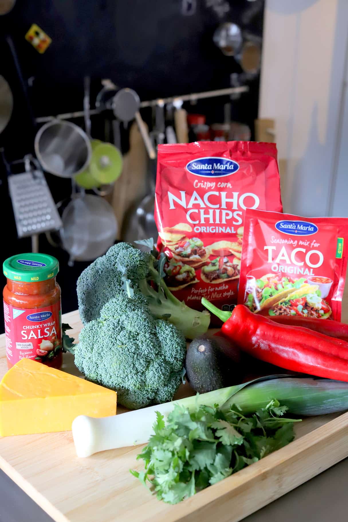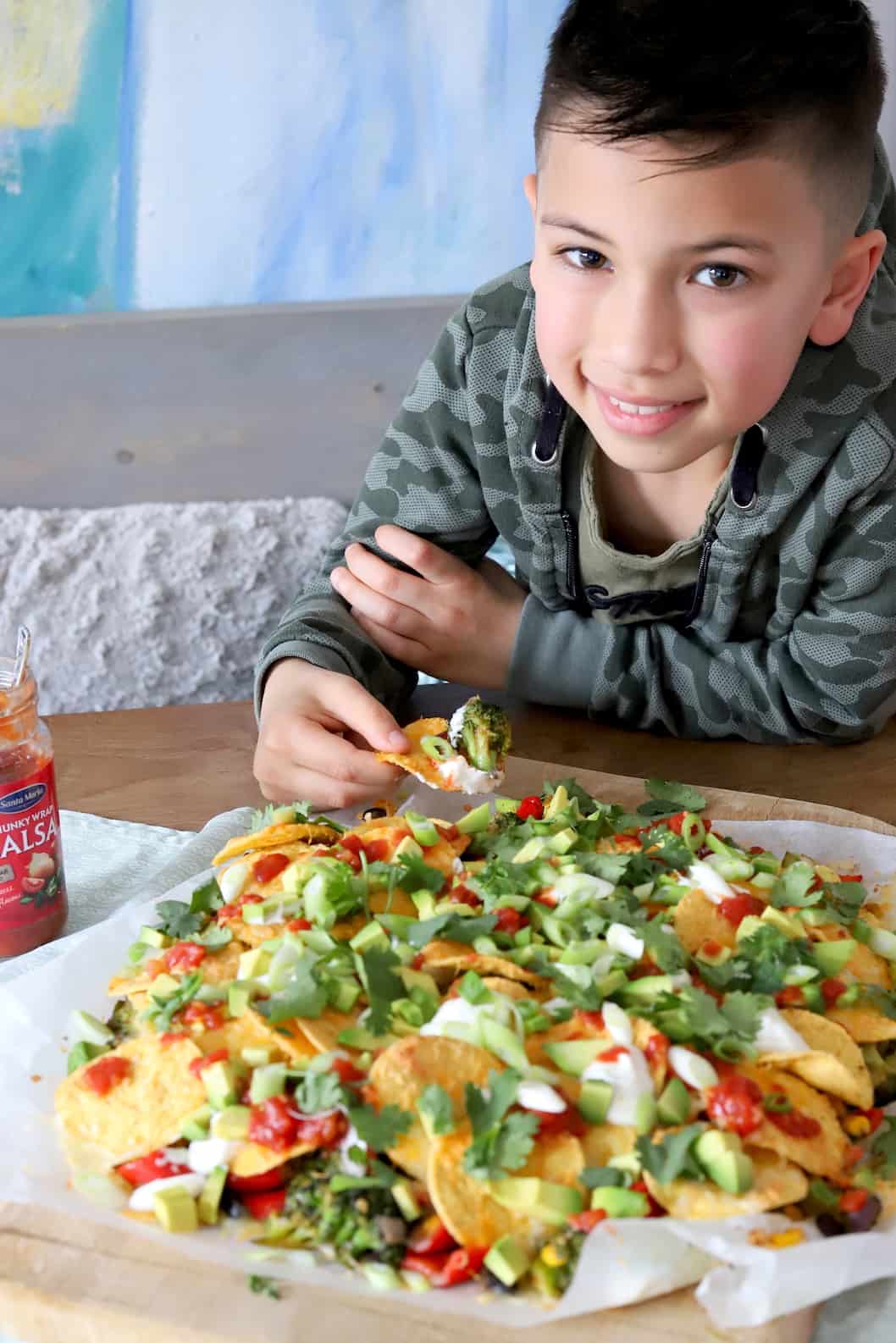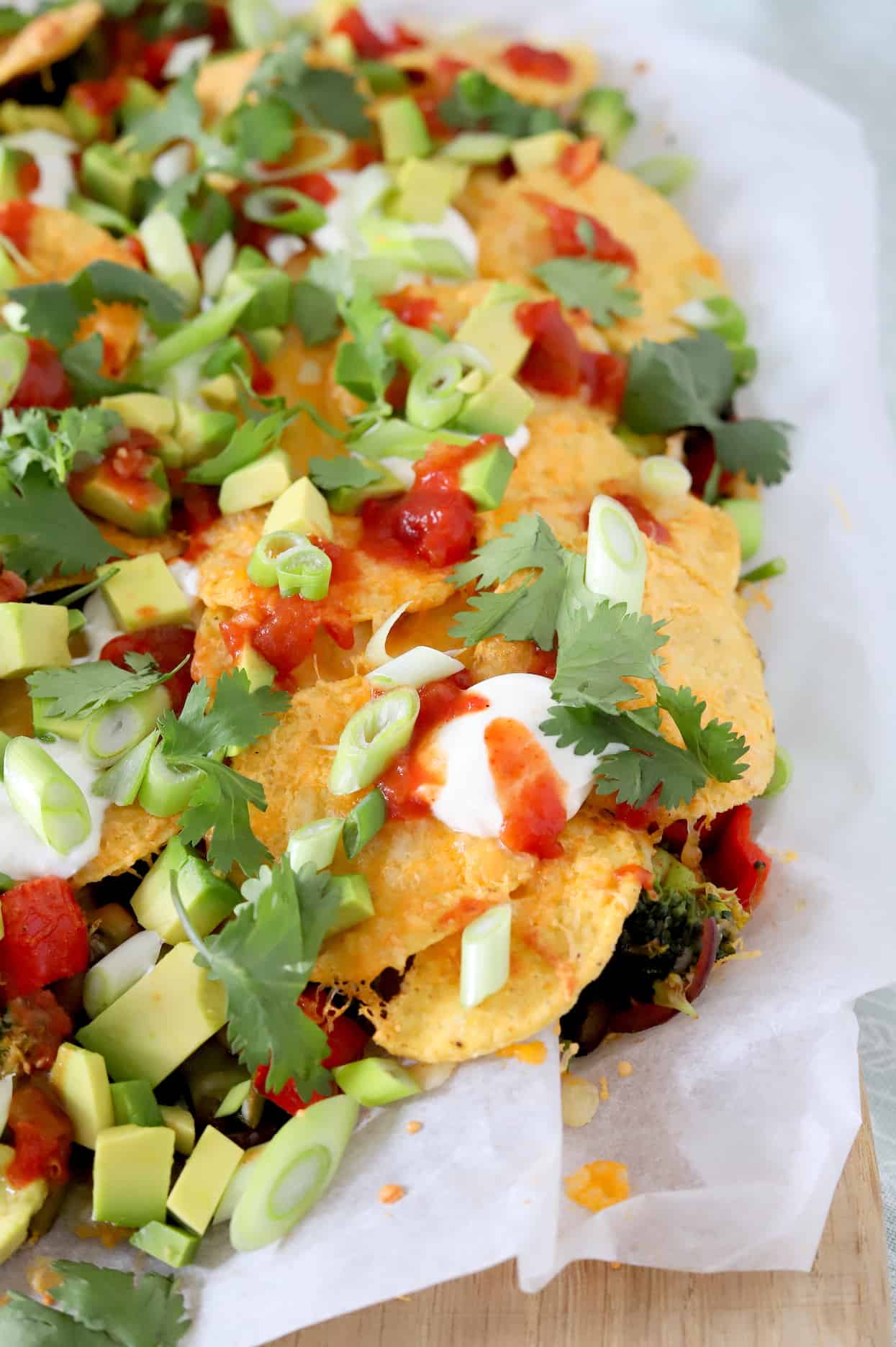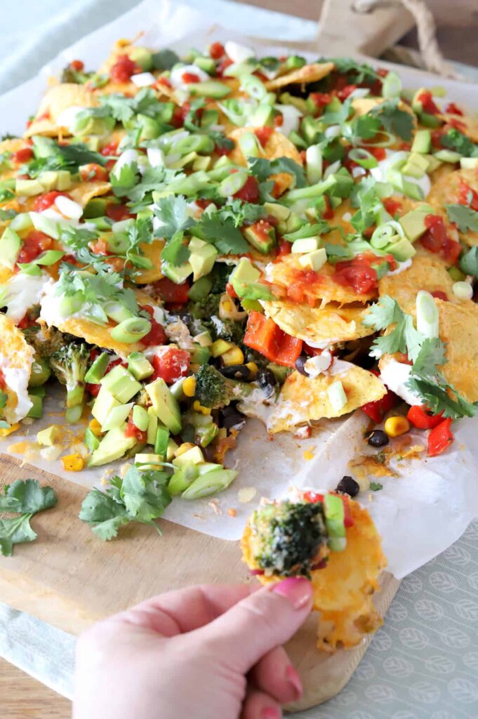 Traditioneel vaak geserveerd met gekruid gehakt, nacho chips en kaas wat allemaal in de oven gaat zodat de kaas kan smelten en alle smaken met elkaar vermengen. Maar deze keer dus geen gehakt, maar lekker veel groenten en peulvruchten op de bodem en afgetopt met nacho’s, sauzen en meer.
