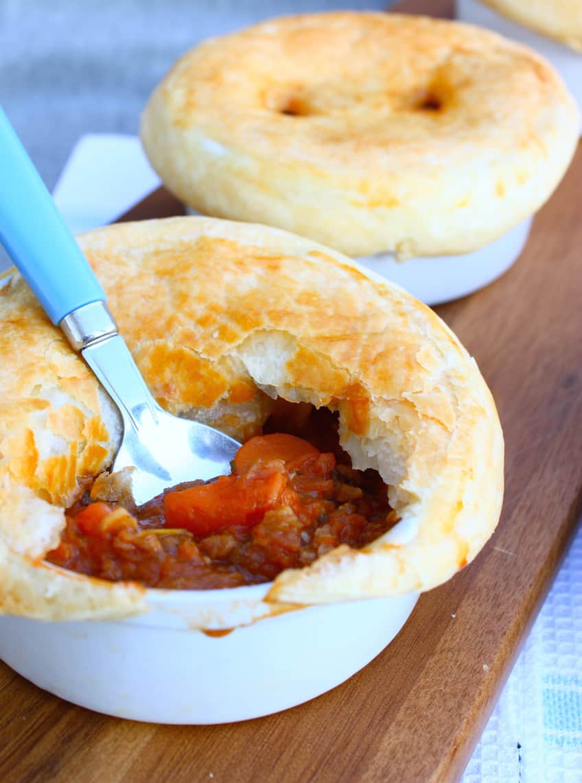 Zet je bakjes 25-30 minuten in de oven totdat de bovenkant gaar en goudbruin is. Serveer je pot pie eventueel met witte rijst, bulgur of farro.