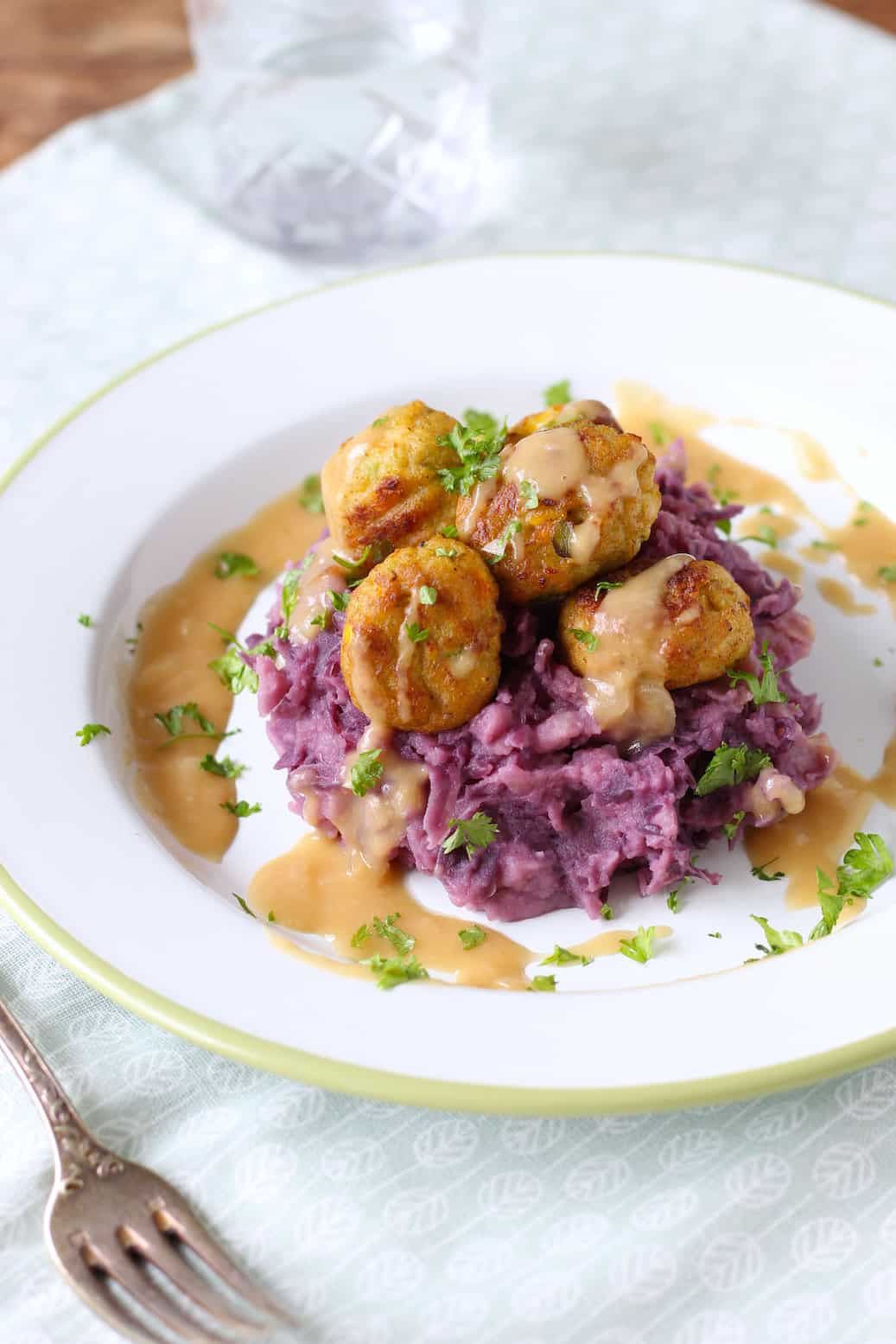 Niet alleen buiten, maar ook in mijn hoofd is de herfst al begonnen. Ik heb namelijk trek in allerlei herfstige gerechten zoals stamppot en stoofvlees. Heerlijk vind ik het om daar wat tijd voor uit te trekken, jammer genoeg is die tijd er alleen vaak doordeweeks niet. Nog vaak genoeg is er de uitdaging om in een korte tijd een voedzame maaltijd op tafel te zetten waarin je toch de meest verse producten gebruikt. Uiteraard laat ik me daardoor niet zomaar uit het veld slaan, en daarom bedacht ik een snellere, lekkere én voedzame stamppot: vegetarische rode kool stamppot met groente gehaktballetjes en vegetarische jus.