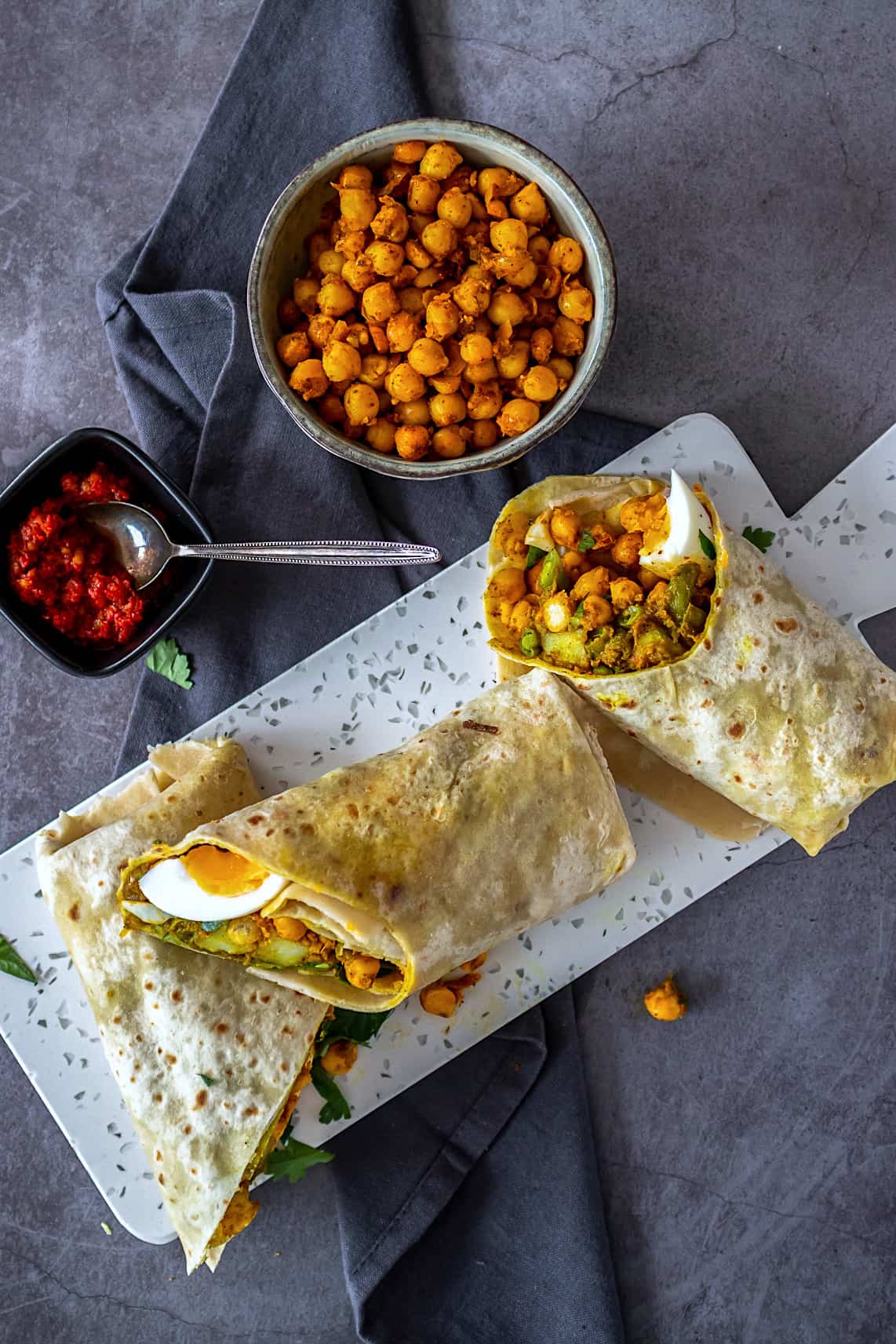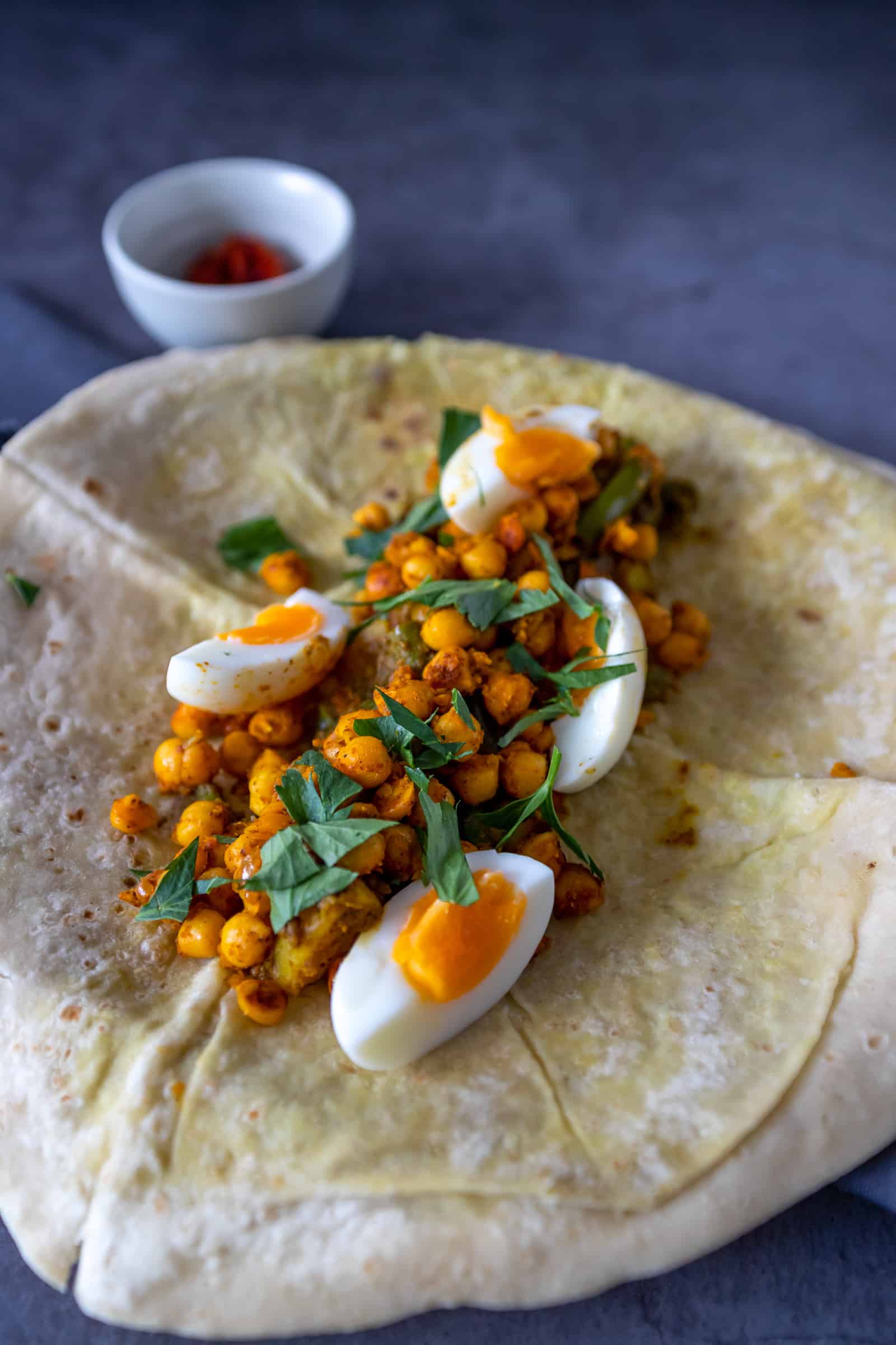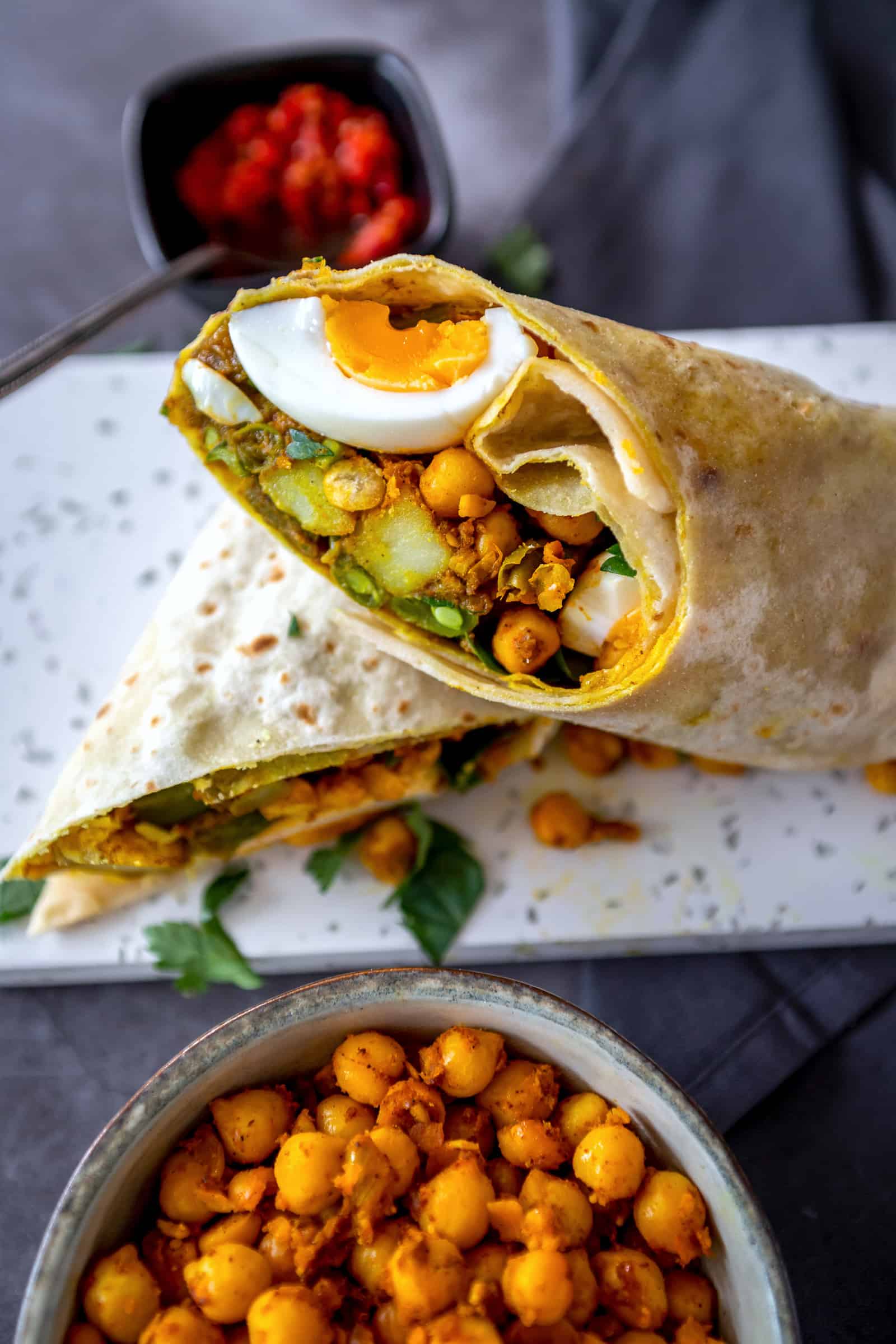 - Warm een roti op en beleg in het midden met de aardappelvulling, een royale schep van de gebakken kikkererwten, wat partjes ei en gehakte selderij. Vouw de korte linker- en rechterkant over de vulling en rol daarna de andere zijde op tot je een rol hebt. Snijd deze doormidden en serveer. Zo kun je makkelijk eten zonder dat de vulling eruit vult. Je kunt ze ook per stuk verpakken in aluminiumfolie en bewaren in de koelkast. De volgende dag kun je ze dan zo in de oven leggen en even oppiepen.