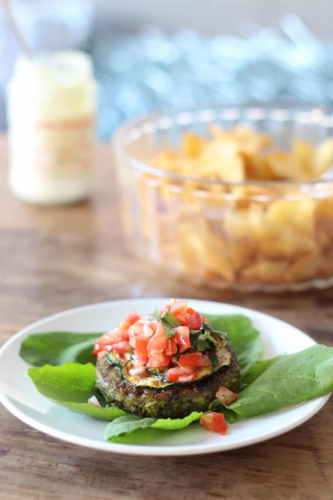 Combineer je vegetarische burger met raapstelen of spinazie als basis en met extra gegrilde courgette en een tomaat-basilicumsalsa. Heerlijke combi. Alsof je een burger eet, maar dan veel lichter en frisser.