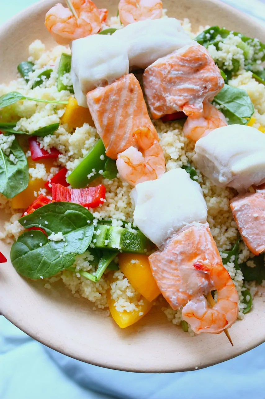 2. Maak 8 spiesen met de blokjes zalm, kabeljauw en garnalen. Bestrooi met peper en zout. Bak ze circa 8 minuten in de oven en draai halverwege om. Je kunt ze ook grillen in een grillpan met een laagje olie.