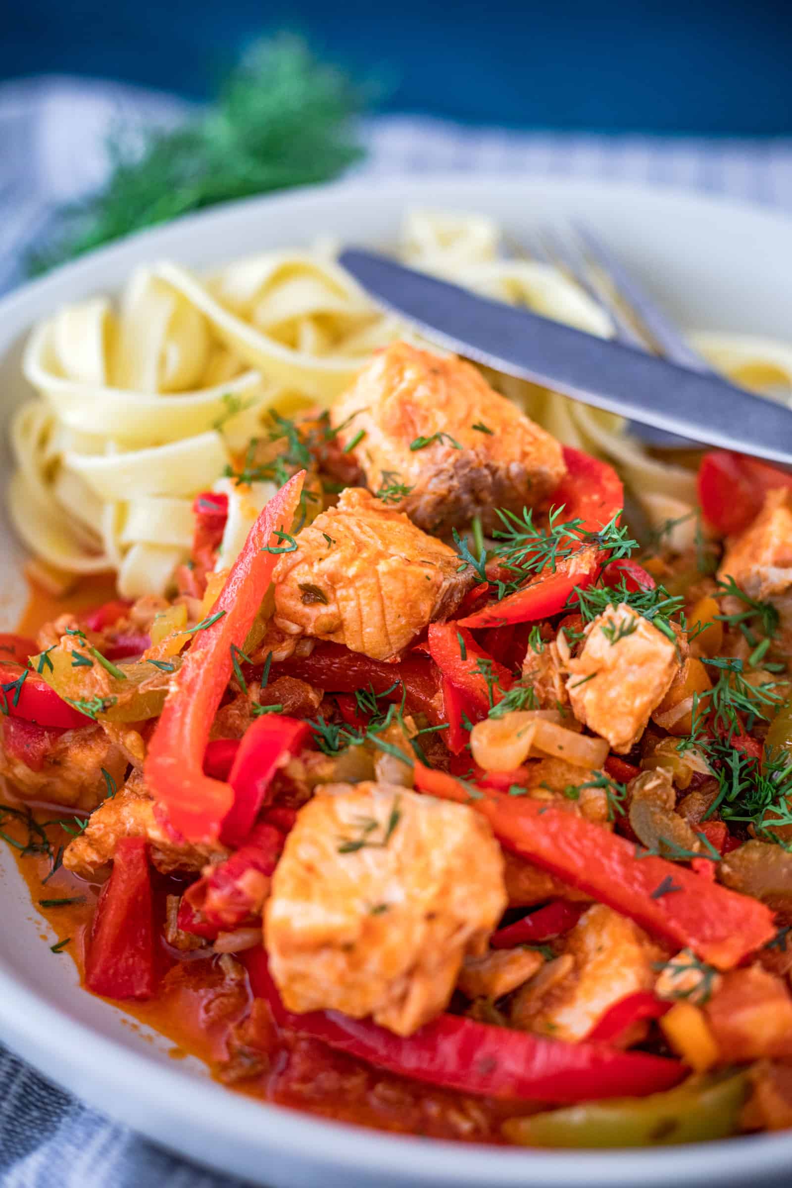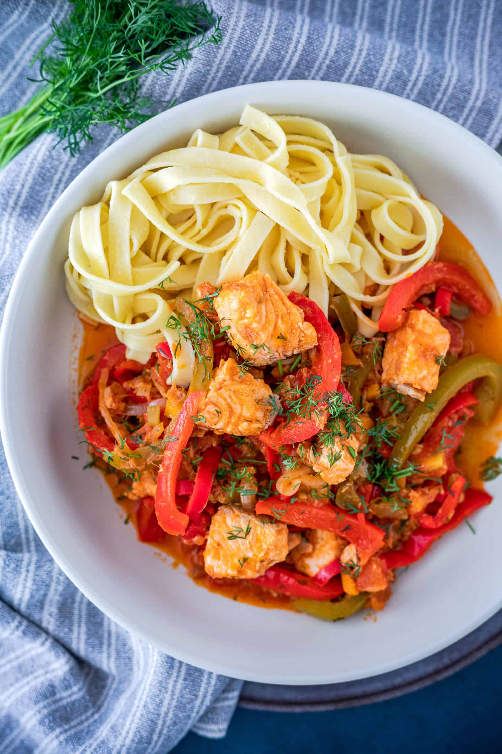 - Serveer het vispotje met de gekookte tagliatelle en garneer royaal met fijngehakte dille.