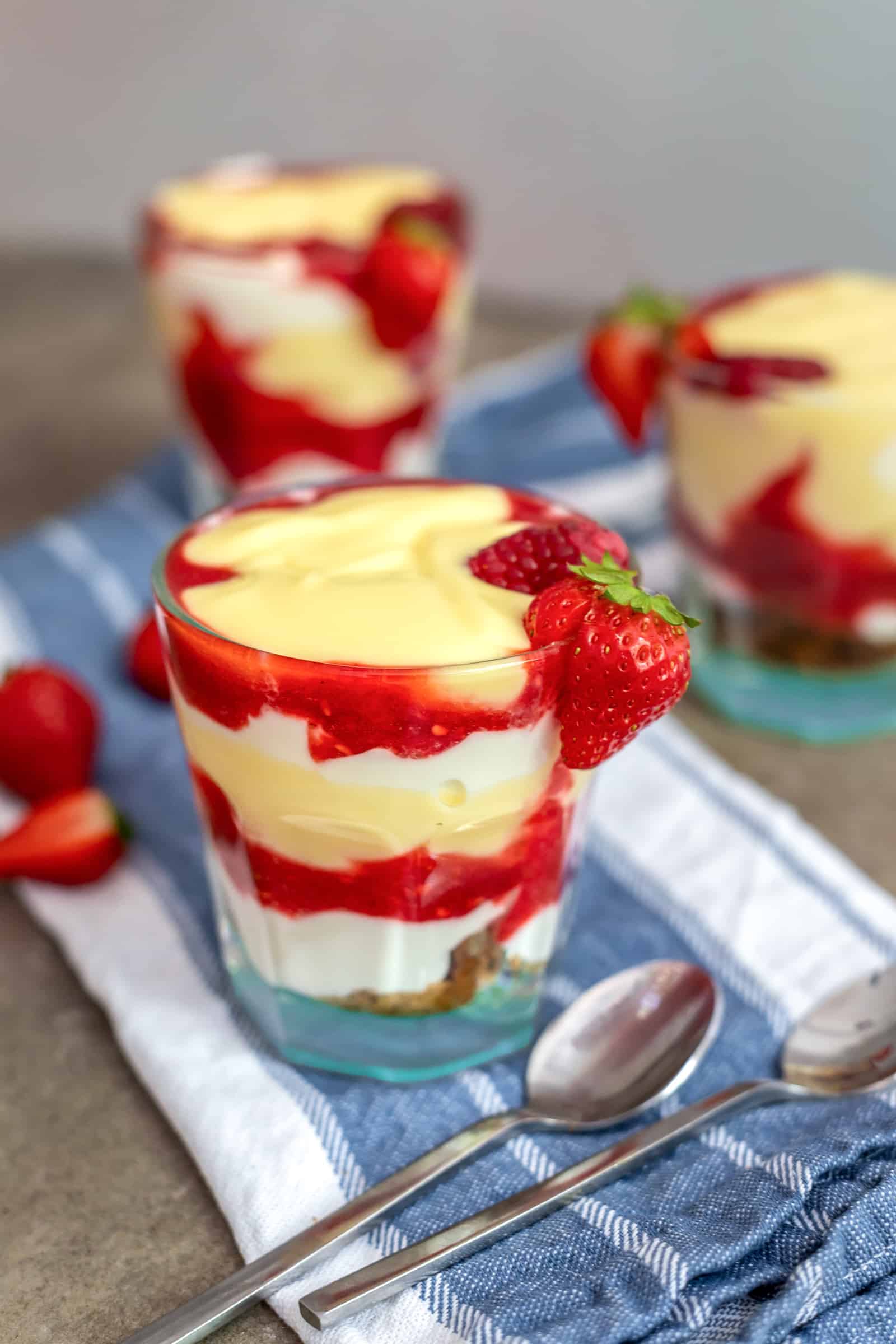 • Schep daarna een laagje Griekse yoghurt in het glas gevolgd door wat gepureerd rood fruit en een laagje vanillevla. Maak de laagjes zo dun dat je dit nog een keer kan herhalen in het glas. Zo zijn alle smaken goed verdeeld en ziet het er extra gezellig uit.
