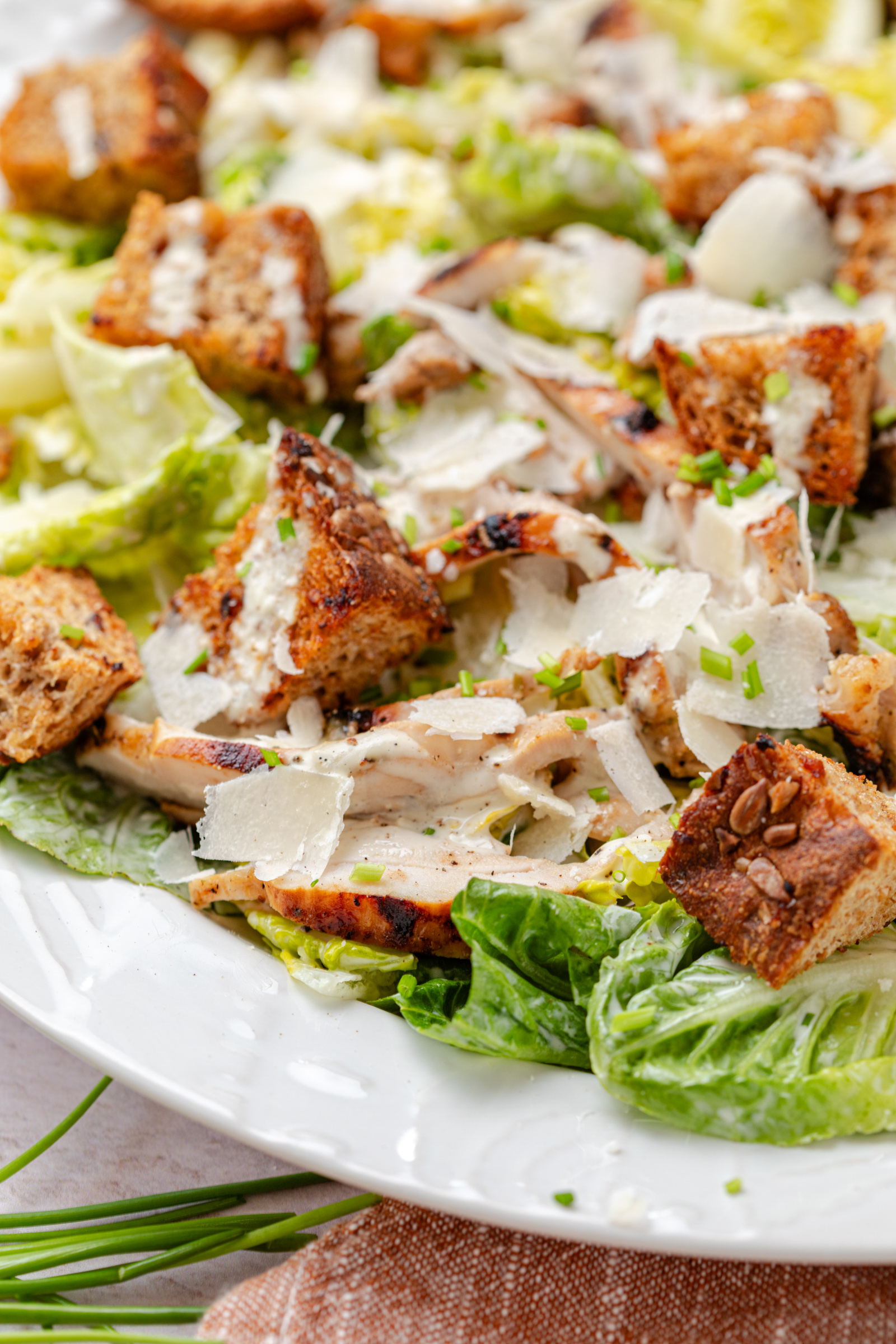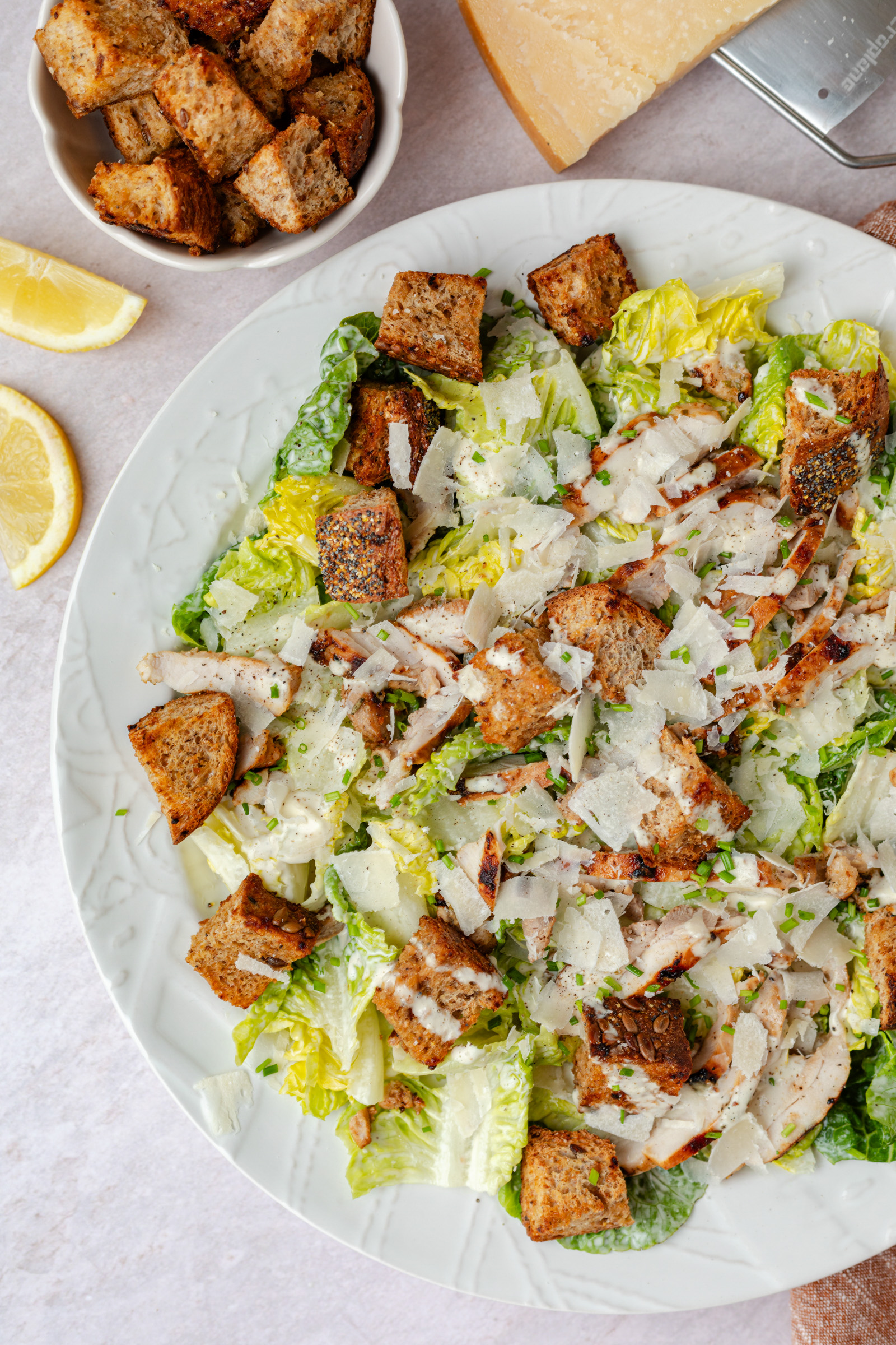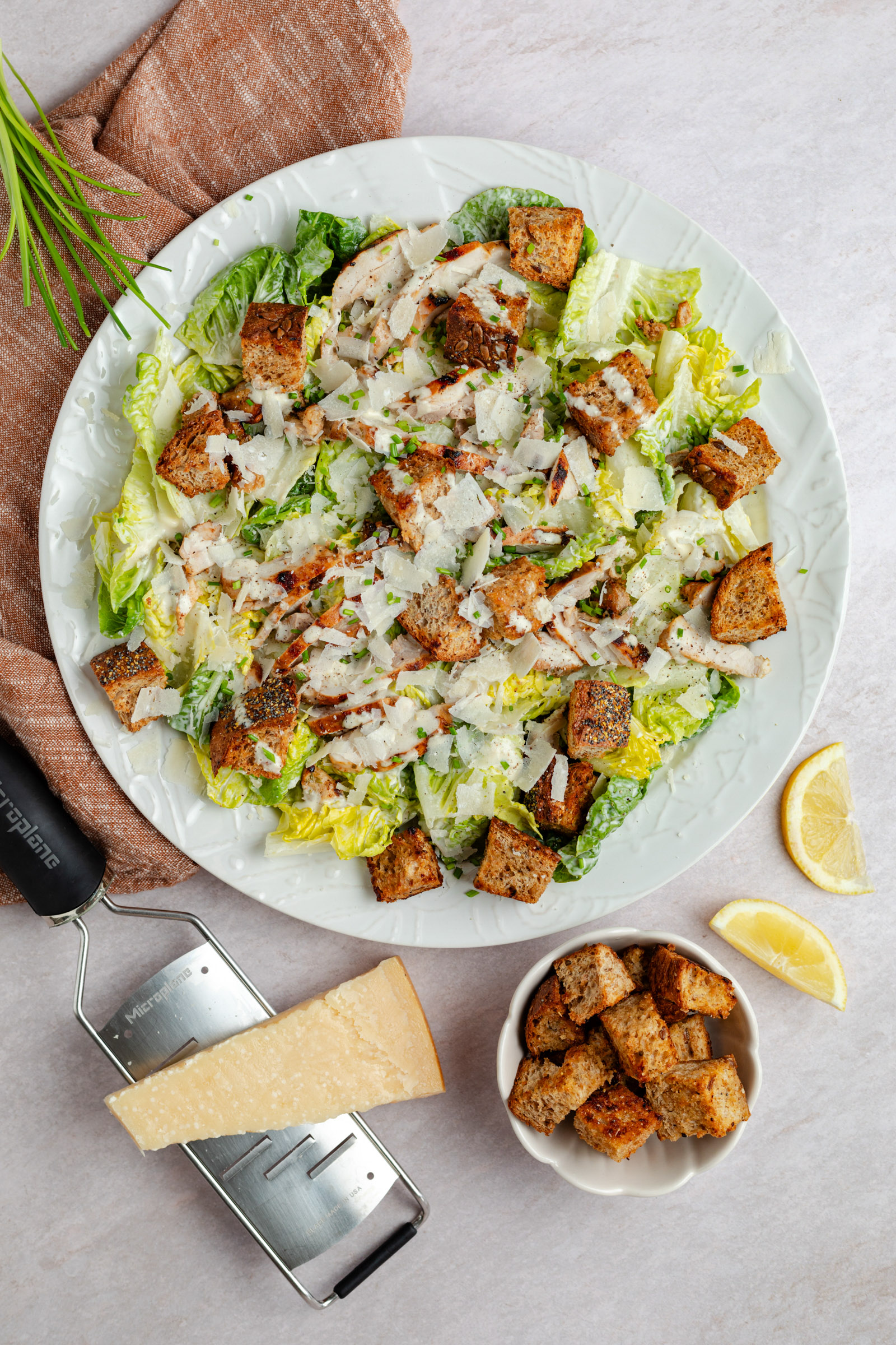 Vaak maak ik een dubbele portie van deze voedzame caesar salade zodat ik er twee dagen van kan eten. Je kunt ook een grotere hoeveelheid kip marineren, die grillen en een deel invriezen. Zo heb je altijd wat op voorraad als je snel een salade wilt maken.