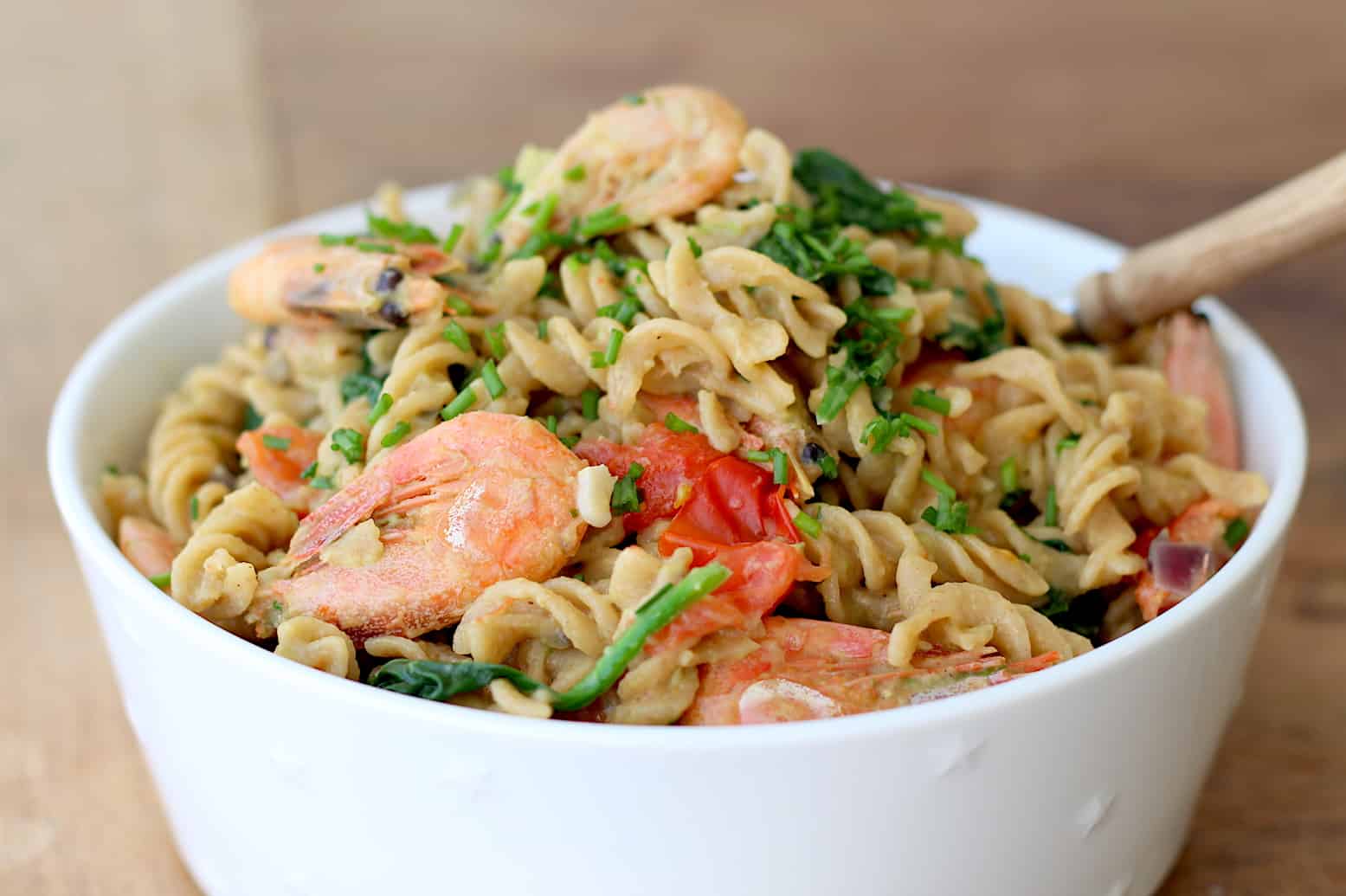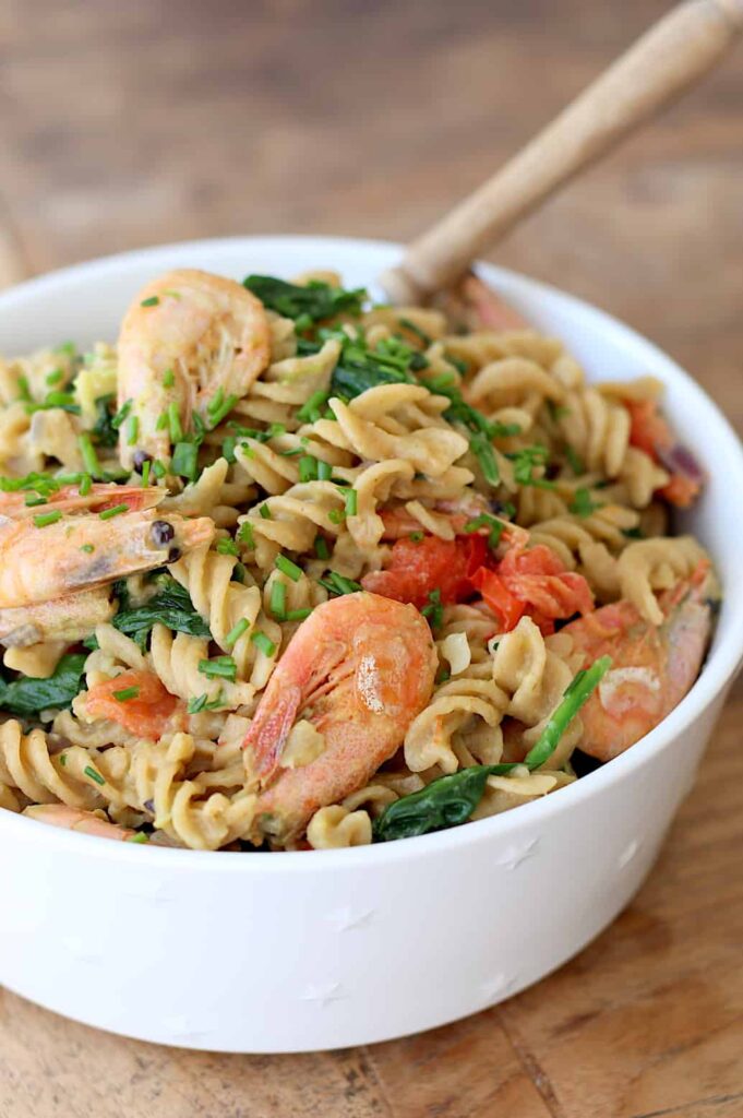 Wanneer je mij een bordje pasta met garnalen voorschotelt ben ik al snel blij. Gelukkig delen mijn mannen deze mening en daarom eten we het geregeld thuis. In dit recept voor volkoren fusilli met garnalen en avocado voegde ik nog wat spinazie en cherrytomaten toe. Door het gerookte paprikapoeder krijgt de smaak meer diepgang, voeg gerust nog wat chilipeper toe voor meer pit.