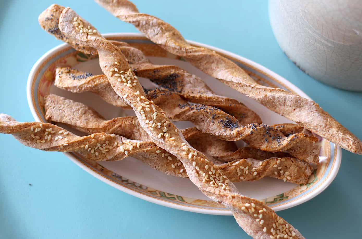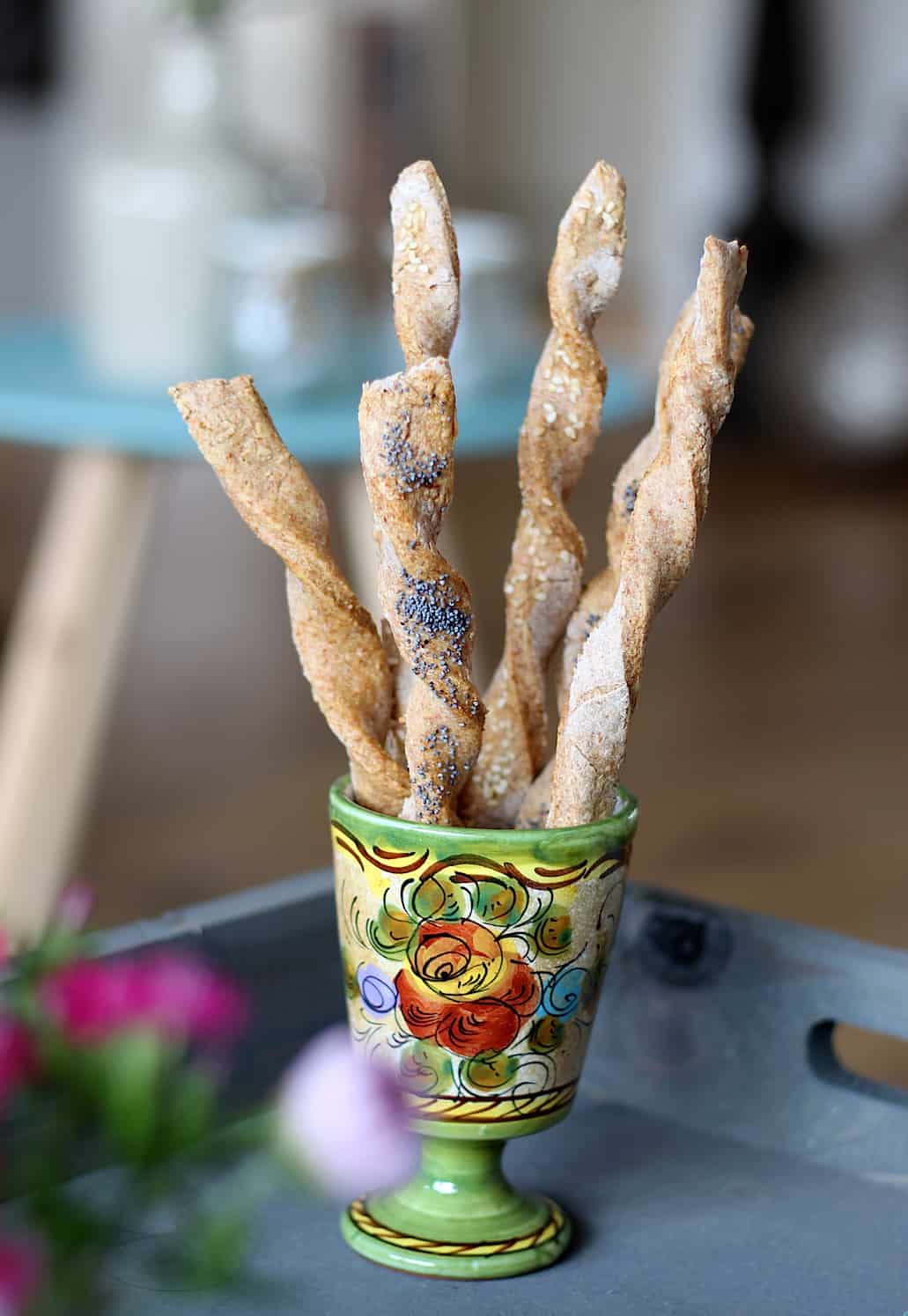 Verwarm de oven voor op 200 graden en bekleed een bakblik met bakpapier. Bestuif je werkvlak met volkoren bloem en leg daar de bol op. Kneed nog een keer door en rol daarna met een deegroller uit tot een rechthoek (ongeveer, luistert niet zo nauw) van circa een halve cm dik . Snijd daar (ongeveer) 16 repen van. Rol van iedere reep een spiraal met je vingers en leg deze op het bakpapier.