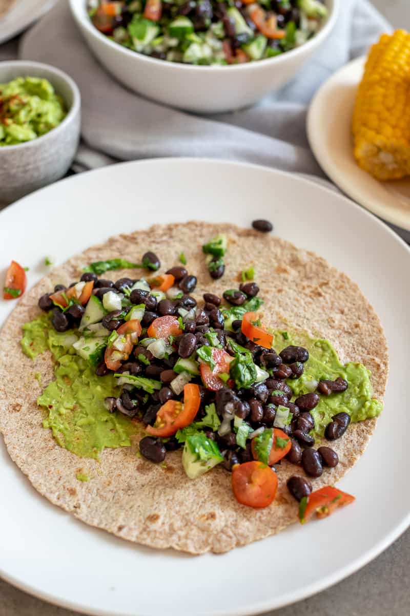 Deze volkoren wraps met bonen, guacamole en maïs zijn niet alleen zo klaar, het gerecht geeft me ook nog eens een instant zomers gevoel! Dat komt door de frisse smaken van citroen en koriander, lekker veel kleur op het bord én door de maïskolven. Die roepen bij mij altijd direct de zomer op! Het is ook echt een perfecte maaltijd voor de wat warmere dagen, omdat je het voornamelijk koud eet.